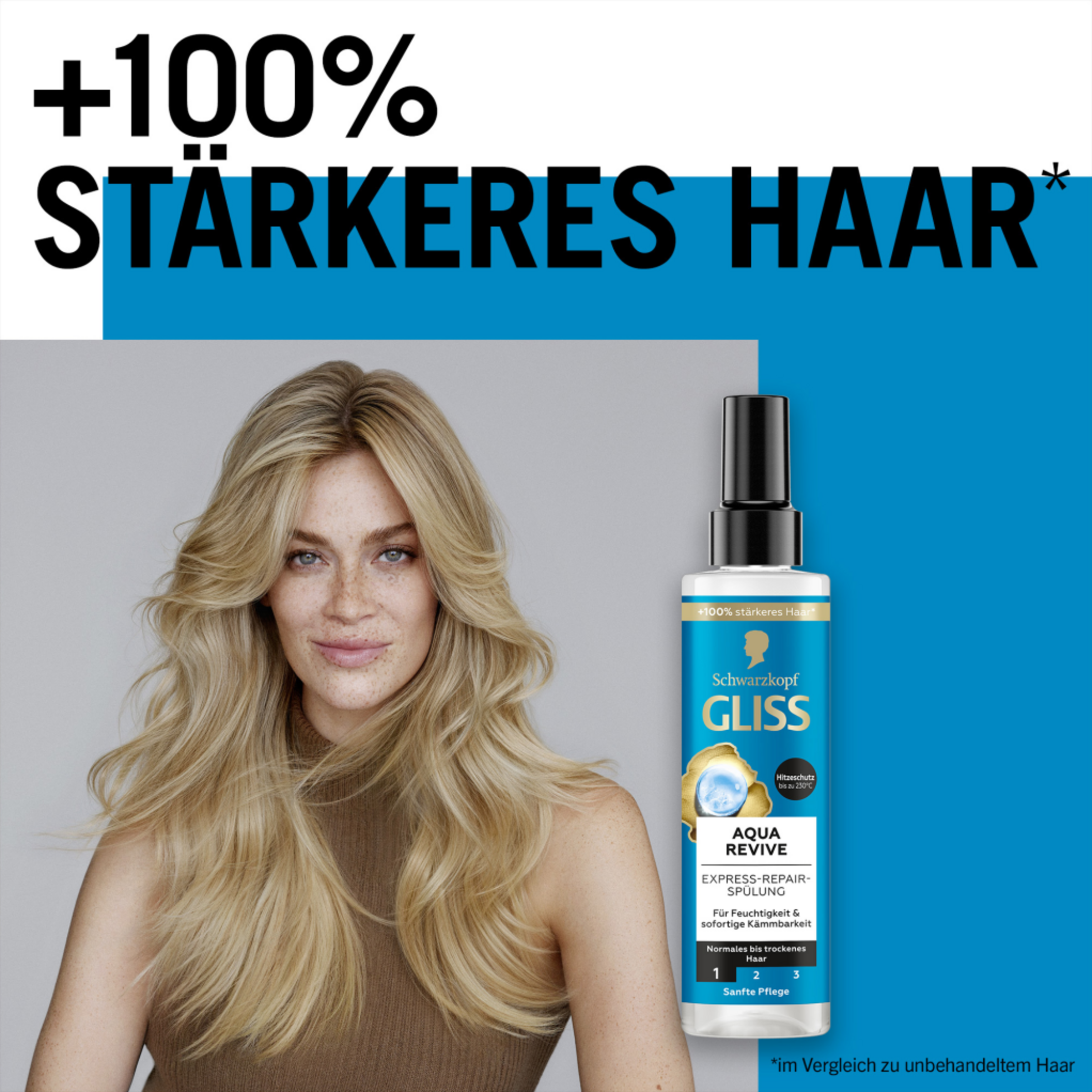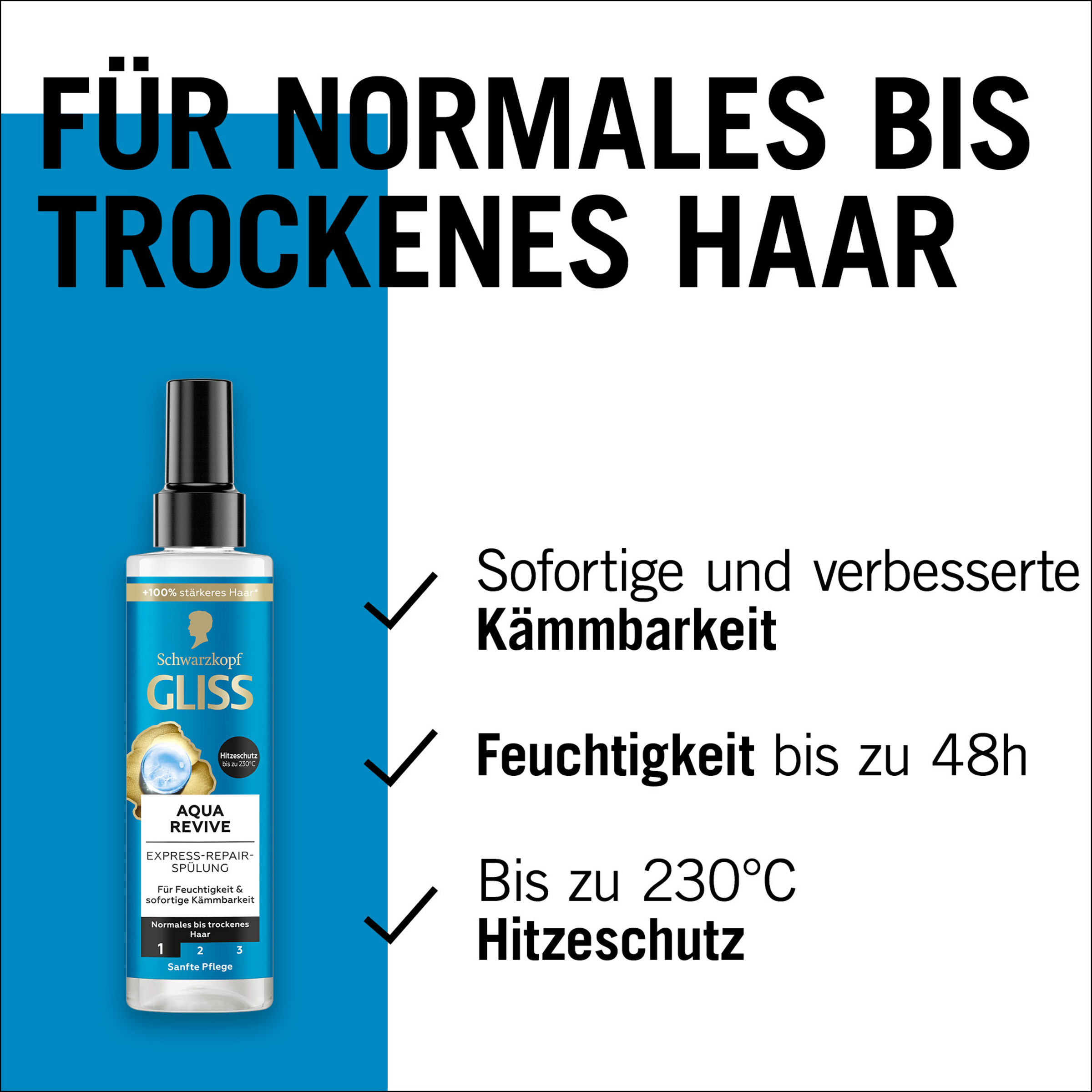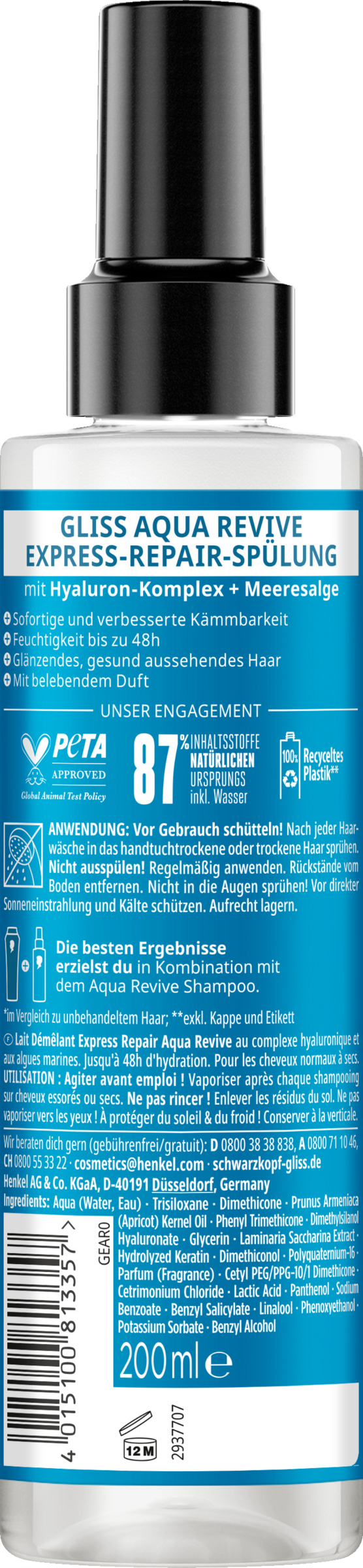 Dein Haar fühlt sich ab und zu trocken und nicht geschmeidig an? Dann benötigt es eine Extraportion Feuchtigkeit für gesunden Glanz und ein seidig-weiches, schwereloses Gefühl. Die Gliss Aqua Revive Sprühspülung mit Hyaluron-Komplex und Meeresalge spendet intensive Pflege für ein mit Feuchtigkeit versorgtes Haargefühl für bis zu 48 Stunden nach nur einer Anwendung. Zusätzlich entwirrt die Spülung das Haar, sorgt für sofortige Kämmbarkeit und Hitzeschutz bis zu 230 °C nach nur einer Anwendung.
