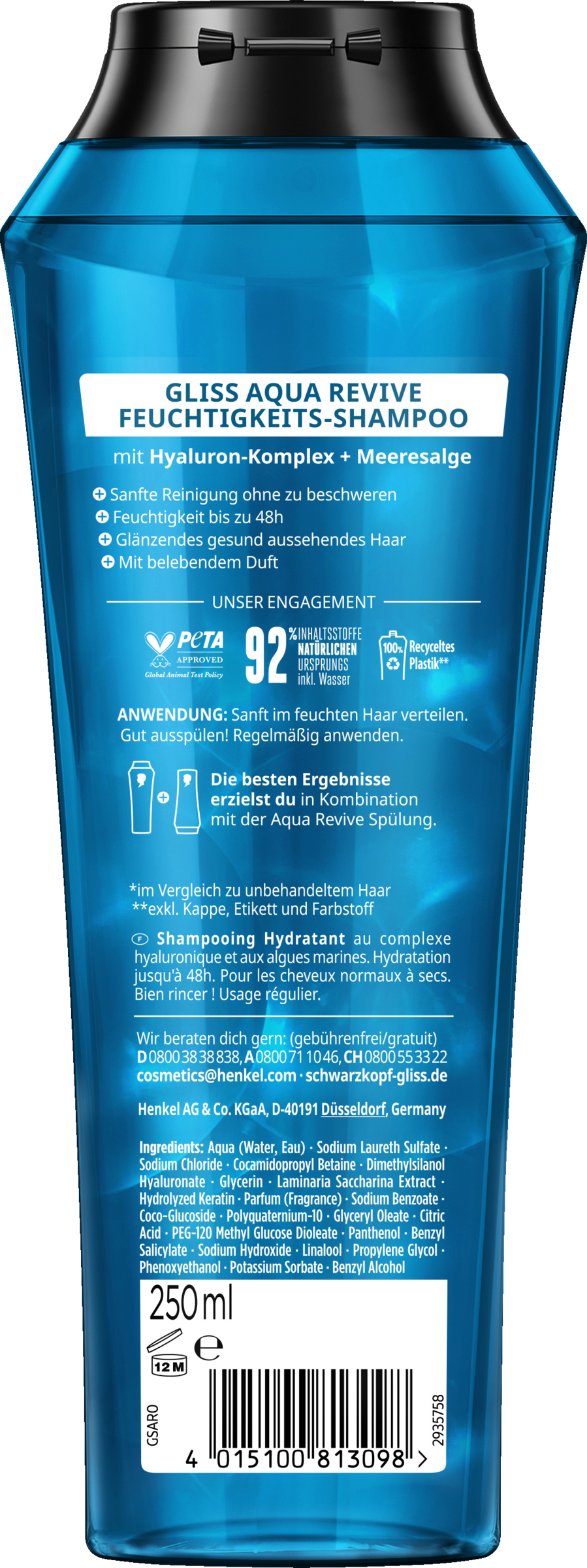 Sanft im feuchten Haar verteilen und gut ausspülen. Regelmäßig zur Haarpflege anwenden und für optimale Ergebnisse anschließend die Aqua Revive Spülung verwenden.