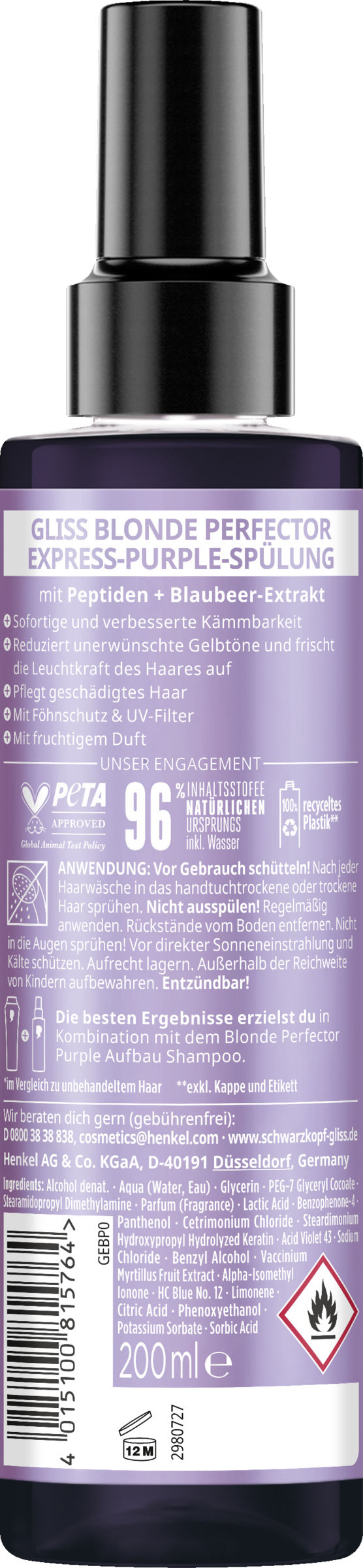 Alcohol denat., Aqua (Water, Eau), Glycerin, PEG-7 Glyceryl Cocoate, Stearamidopropyl Dimethylamine, Parfum (Fragrance), Lactic Acid, Benzophenone-4, Panthenol, Cetrimonium Chloride, Steardimonium Hydroxypropyl Hydrolyzed Keratin, Acid Violet 43, Sodium Chloride, Benzyl Alcohol, Vaccinium Myrtillus Fruit Extract, Alpha-Isomethyl Ionone, HC Blue No. 12, Limonene, Citric Acid, Phenoxyethanol, Potassium Sorbate, Sorbic Acid