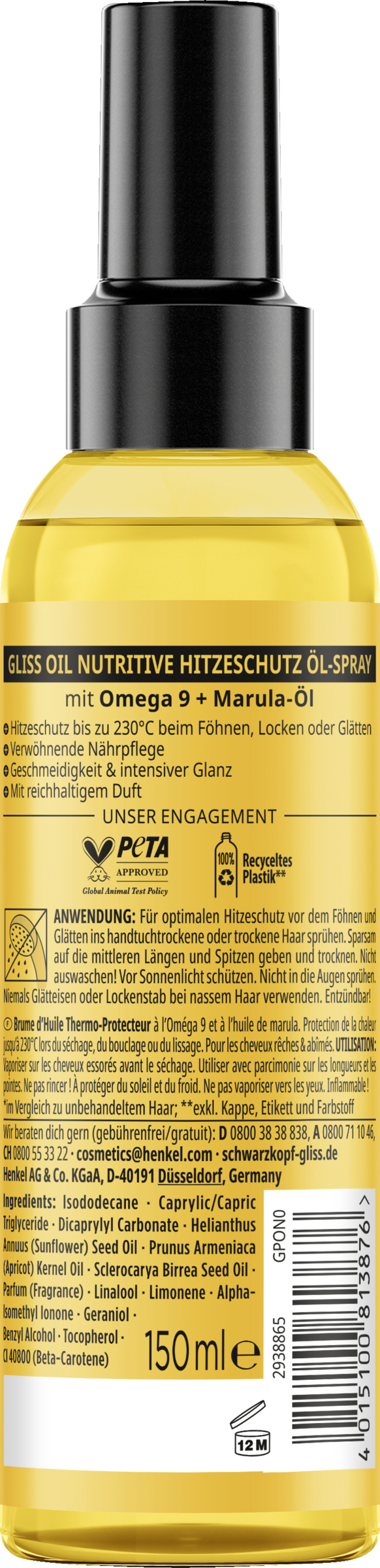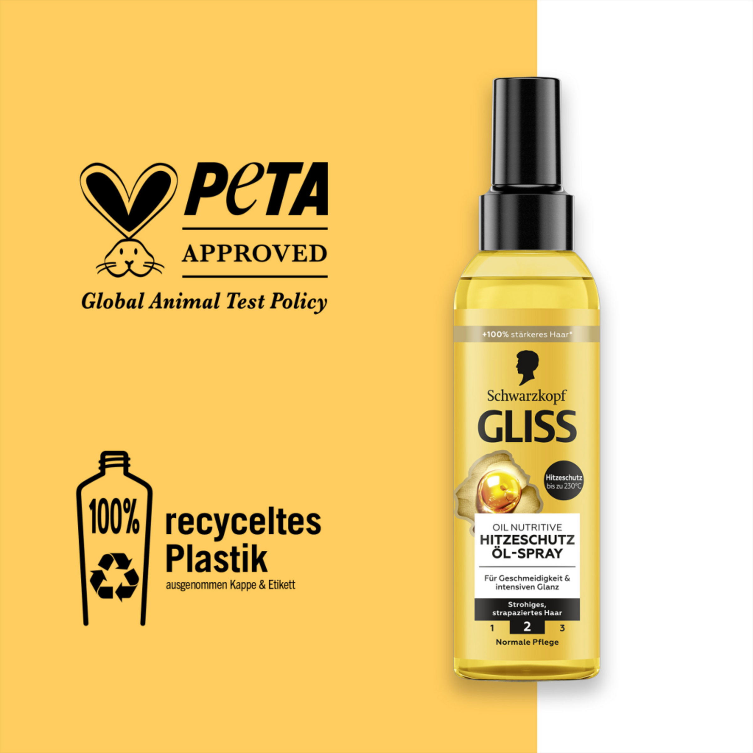 Du möchtest deine Haare föhnen, locken oder glätten, sie aber nicht überstrapazieren und beschädigen? Das Oil Nutritive Hitzeschutz Öl-Spray schützt das Haar beim Haarstyling vor Hitze bis zu 230 °C, während es das Haar zusätzlich pflegt und nährt. Die Formel mit Omega 9 und Marula-Öl ist speziell abgestimmt auf die Bedürfnisse von strohigem, strapaziertem Haar. Mit dem leichten Hitzeschutz Spray erhältst du sinnliche Geschmeidigkeit und intensiven Glanz. Eine Kombination aus hochwertigen Haar-Aktivstoffen & Essenzen der Natur ist die Basis aller Gliss Formeln. Sie sind auf die speziellen Bedürfnisse der Haare zugeschnitten und sorgen für Reparatur und eine sichtbar verbesserte Haarqualität. Der Flaschenkörper besteht aus 100 % recyceltem Material¹. Das Hitzeschutz Öl-Spray ist von PETA zertifiziert².
