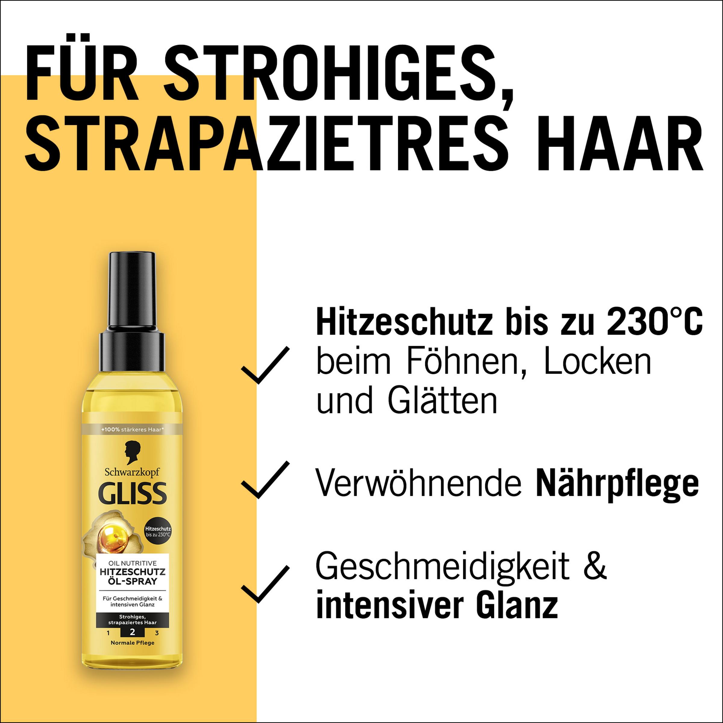 Gliss Oil Nutritive Hitzeschutz Öl-Spray – Pflegt und schützt das Haar vor Hitze bis zu 230 °C.