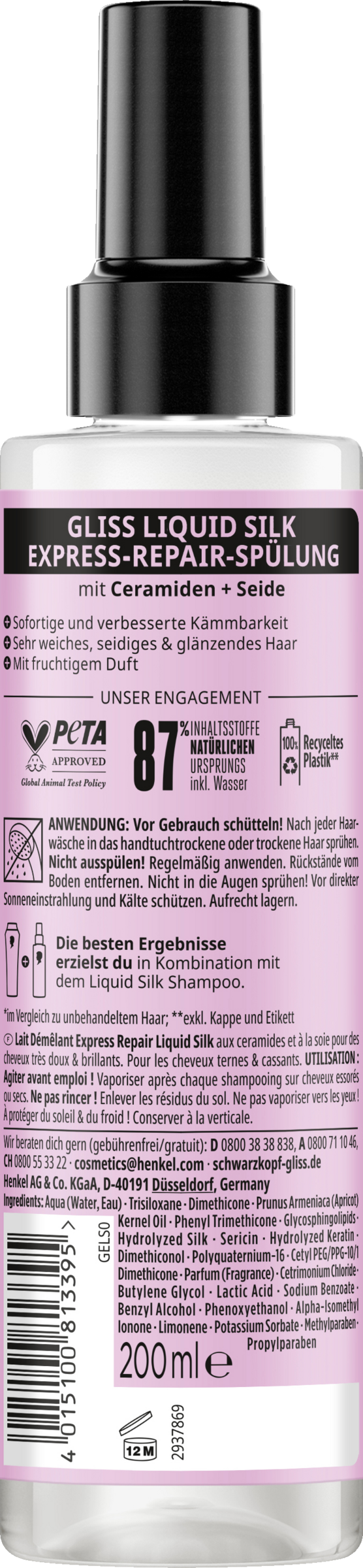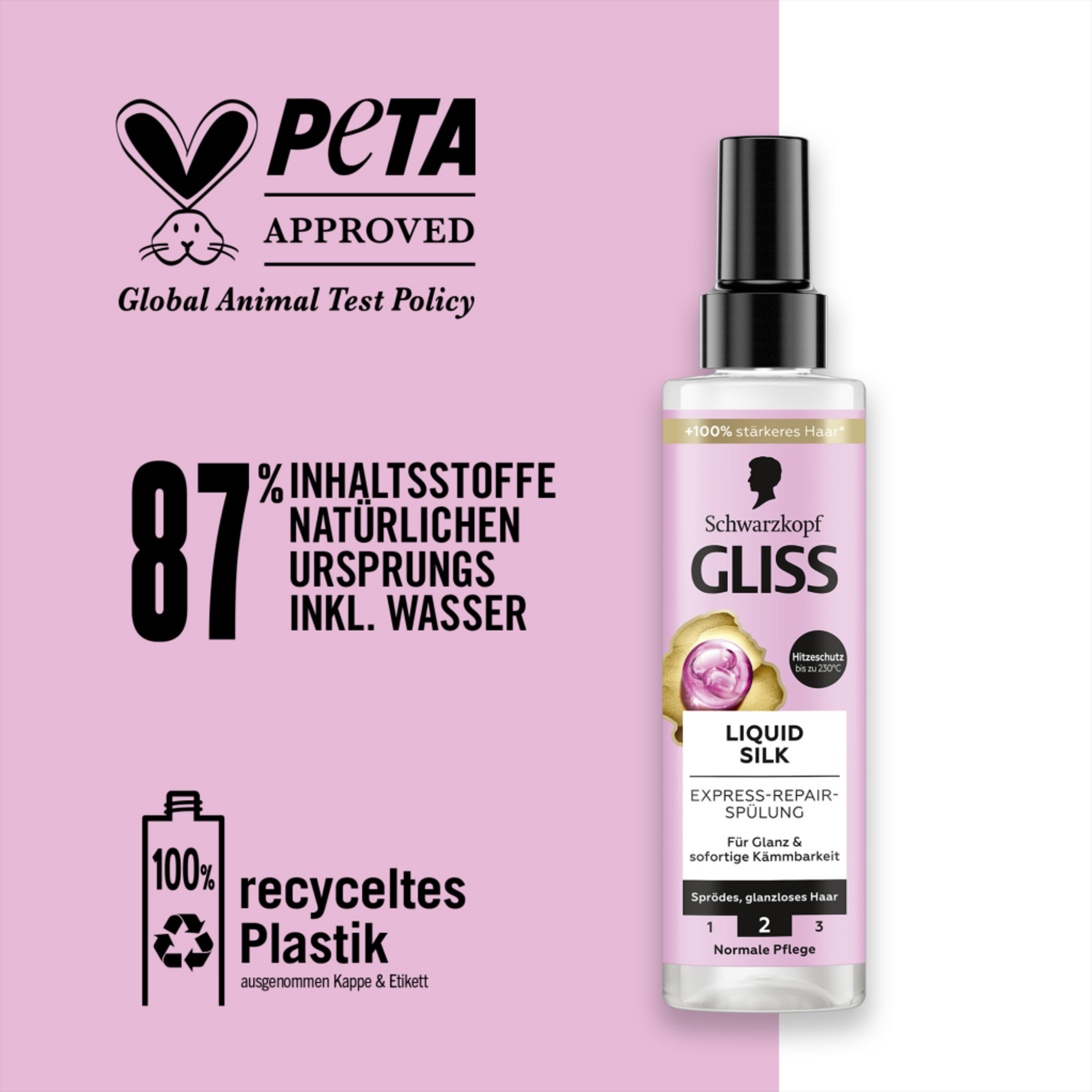 Eine Kombination aus hochwertigen Haar-Aktivstoffen & Essenzen der Natur ist die Basis aller Gliss Formeln. Sie sind auf die speziellen Bedürfnisse der Haare zugeschnitten und sorgen für Reparatur und eine sichtbar verbesserte Haarqualität. Die Pflegespülung besteht zu 87 % aus Inhaltsstoffen natürlichen Ursprungs¹. Die Spülung ist von PETA² zertifiziert und der Flaschenkörper besteht aus 100 % recyceltem Kunststoff³.