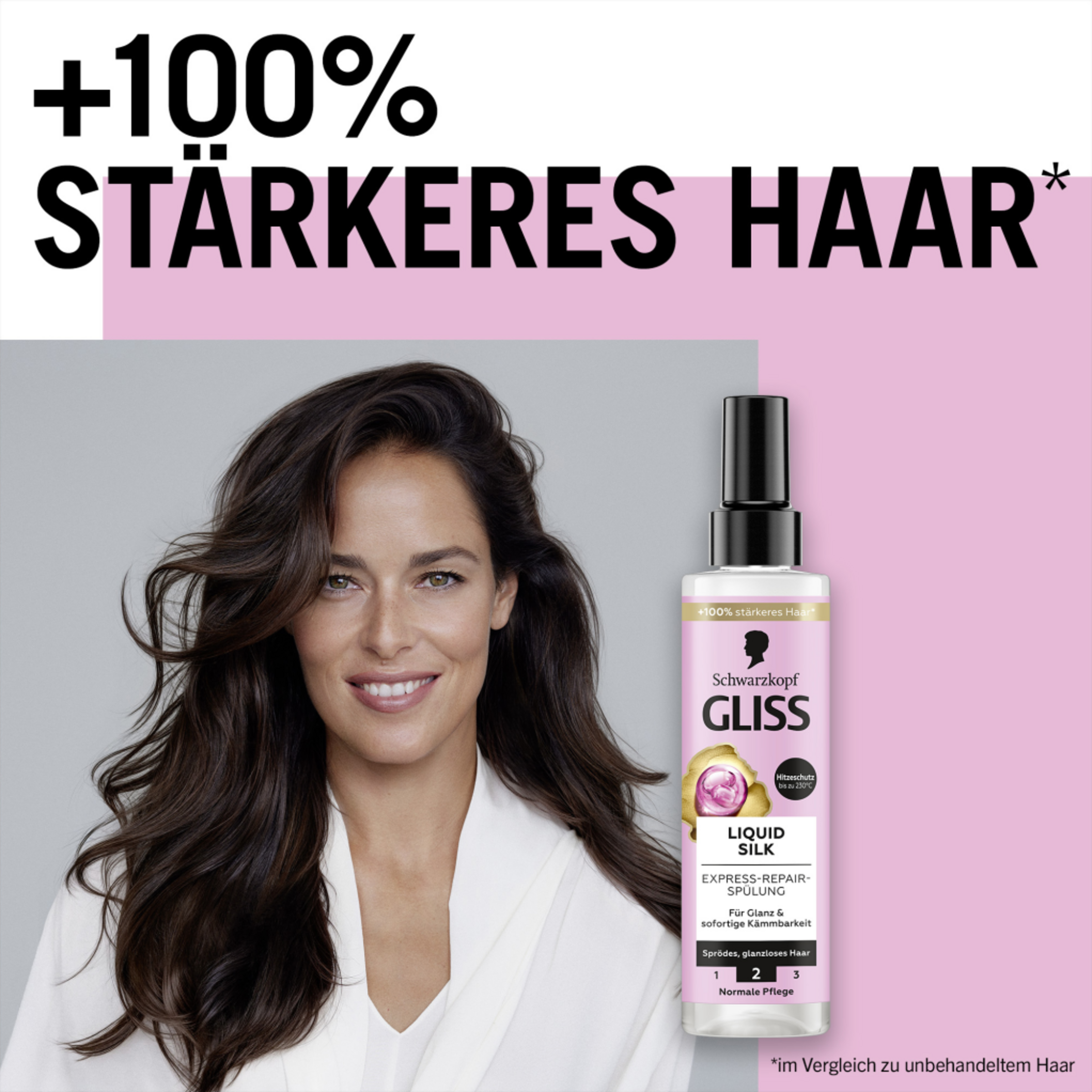 Eine aufgeraute Haaroberfläche macht das Haar spröde und glanzlos. Dieses Haar braucht intensive Pflege, um die Haarfaser wieder zu glätten und das Haar dadurch seidig weich zu machen. Speziell abgestimmt auf die Bedürfnisse von sprödem und glanzlosem Haar, glättet die Gliss Spülung, die Ceramide und Seide enthält, die Haaroberfläche und intensiviert den natürlichen Glanz sowie die Geschmeidigkeit – für Haare wie Seide. Zusätzlich bietet die Sprühspülung Hitzeschutz bis 230 °C.