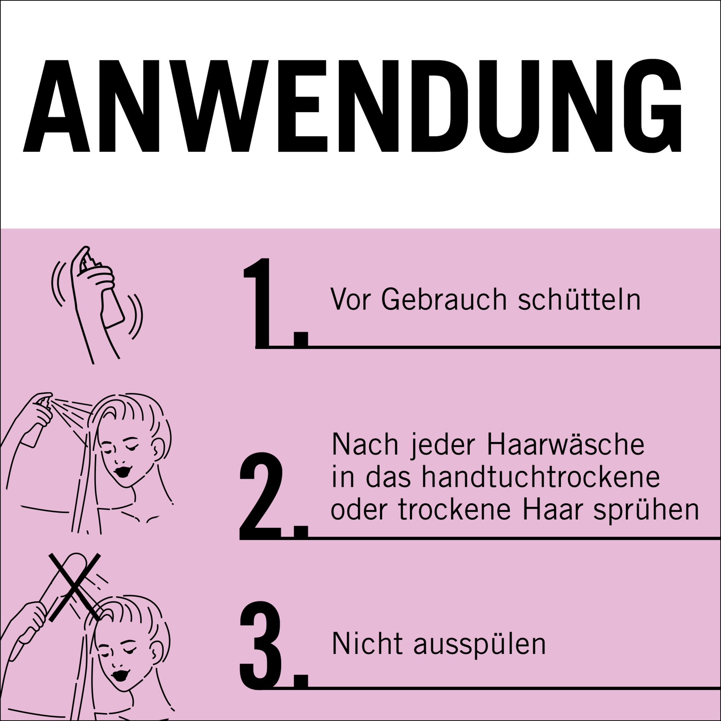 Vor Gebrauch schütteln! Nach jeder Haarwäsche in das handtuchtrockene oder trockene Haar sprühen. Nicht ausspülen! Regelmäßig anwenden.