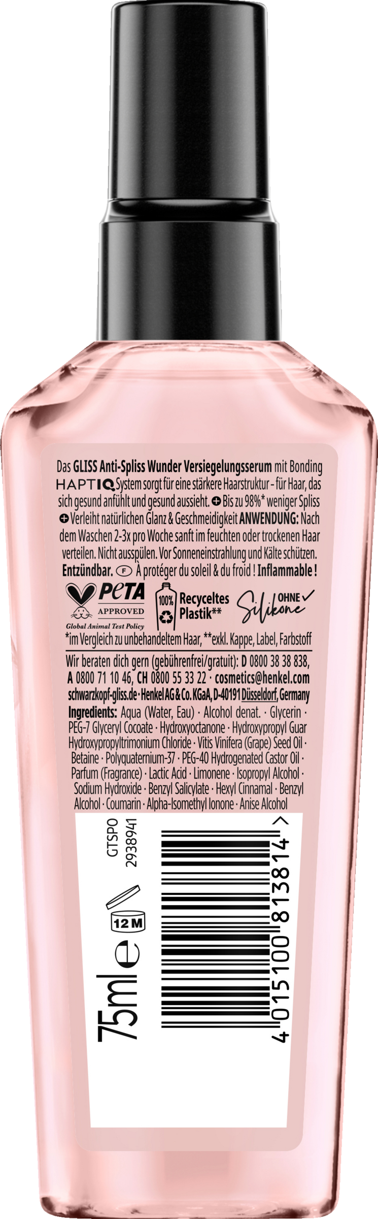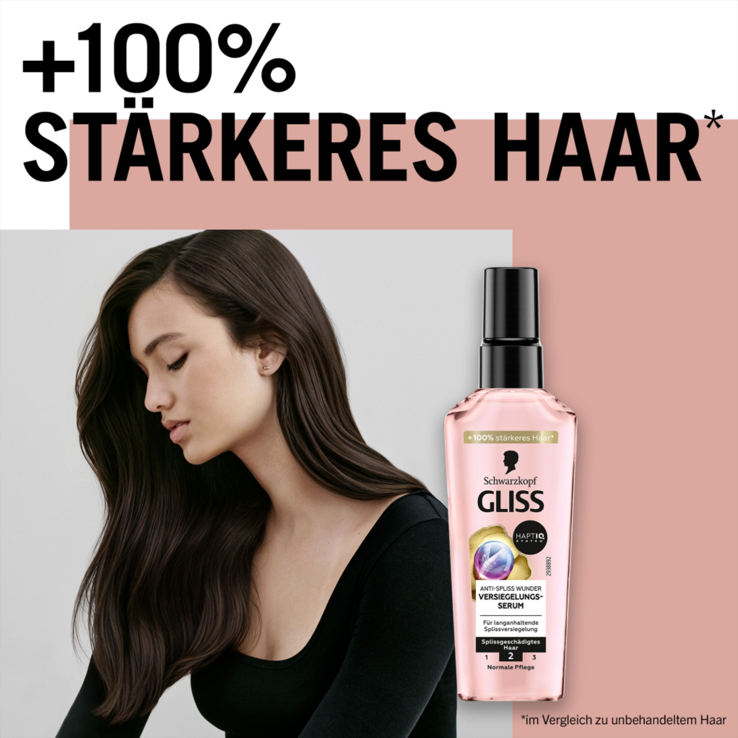 Keine Lust mehr auf Spliss und häufiges Spitzen schneiden? Versiegle Spliss langanhaltend! Mit HAPTIQ System gleicht das Gliss Serum Unebenheiten in der Haarstruktur vom Ansatz bis in die Spitzen aus. Das Serum wirkt wie ein Reißverschluss für das Haar und versiegelt Haarspliss langanhaltend – für bis zu 98 % weniger Spliss¹. Es verleiht natürlichen Glanz und Geschmeidigkeit. Außerdem schützt das Serum das Haar während des Föhnens. Eine Kombination aus hochwertigen Haar-Aktivstoffen & Essenzen der Natur ist die Basis aller Gliss Formeln. Sie sind auf die speziellen Bedürfnisse der Haare zugeschnitten und sorgen für Reparatur und eine sichtbar verbesserte Haarqualität. Gliss Haarprodukte sind von PETA zertifiziert² und der Flaschenkörper dieses Haarpflege-Serums besteht aus 100 % recyceltem Kunststoff³.
