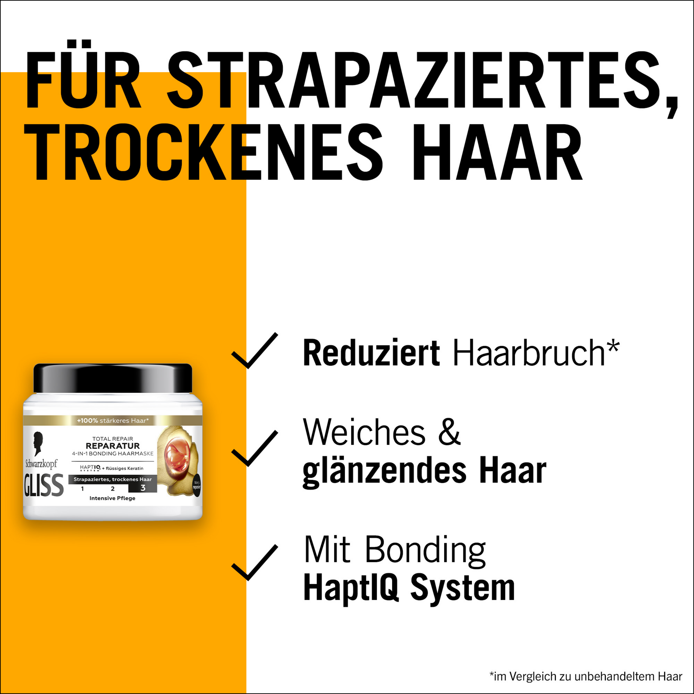 Unsere Haare sind täglichen Belastungen ausgesetzt. Dadurch werden sie trocken, strapaziert und es kann Haarbruch entstehen. So beanspruchtes Haar benötigt eine wirksame Reparatur sowie eine Glättung der Haaroberfläche. Mit HAPTIQ System und flüssigem Keratin schützt die Gliss Haarmaske für trockenes Haar die Haarfaser und verschönert die Haarstruktur. Die Keratin Haarkur sorgt außerdem für weniger Haarbruch¹. So wird das Haar fühlbar geschmeidig und erhält einen natürlichen Glanz. Die Haarkur sorgt für kräftigende Pflege vor, während und nach der Haarwäsche.