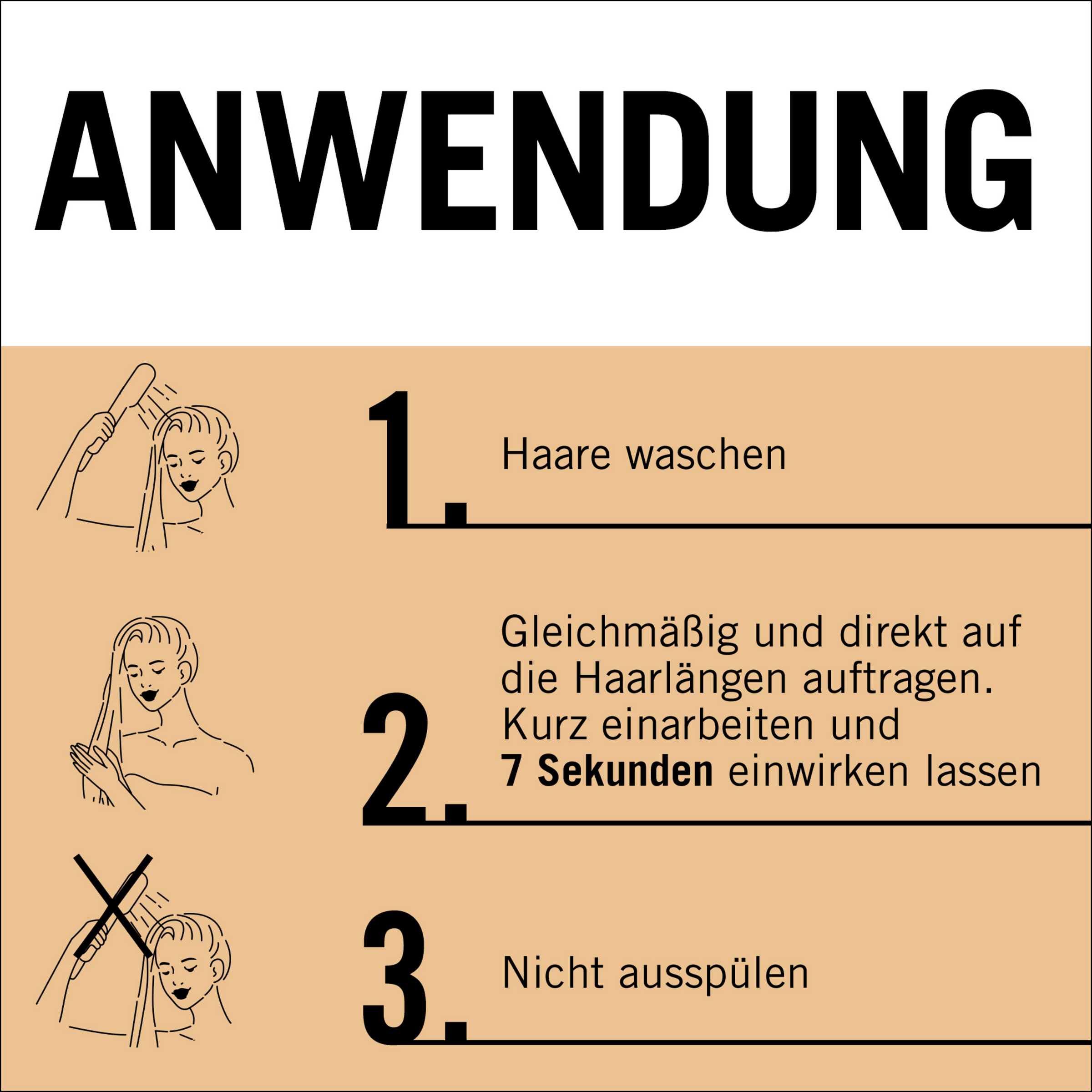 1) Haare waschen. 2) Gleichmäßig und direkt auf die Haarlängen auftragen. Kurz einarbeiten und 7 Sekunden einwirken lassen. 3) Sorgfältig ausspülen.