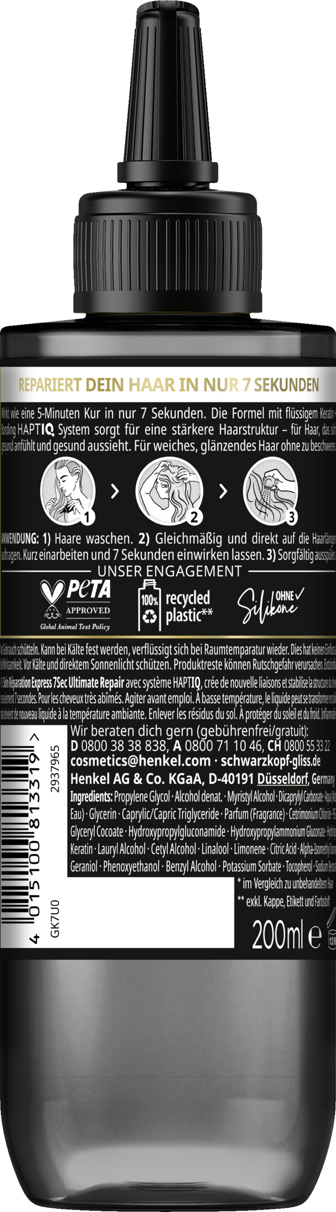 Die Formelinnovation: Repariere dein Haar in nur 7 Sekunden. Die Gliss 7 Sec ist effektiv wie eine 5-Minuten Kur in nur 7 Sekunden und verwandelt sich bei Anwendung in eine cremige Textur, für glänzendes, repariertes Haar. Die Gliss 7 Sekunden Express Kur ist abgestimmt auf sehr geschädigtes, trockenes Haar und sorgt für 100 % stärkeres Haar¹. Die Haarpflege kombiniert das HAPTIQ-System mit flüssigem Keratin.