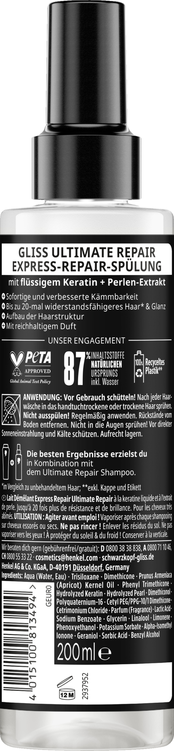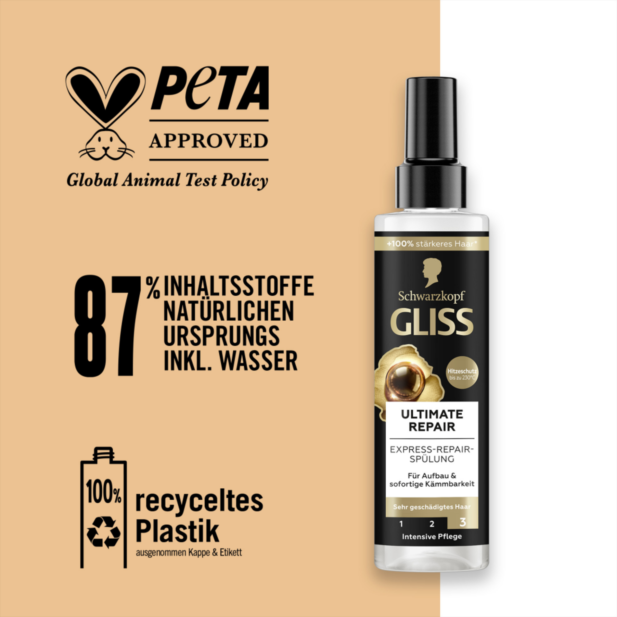 Eine Kombination aus hochwertigen Haar-Aktivstoffen & Essenzen der Natur ist die Basis aller Gliss Formeln. Sie sind auf die speziellen Bedürfnisse der Haare zugeschnitten und sorgen für Reparatur und eine sichtbar verbesserte Haarqualität. Die Pflegespülung besteht zu 87 % aus Inhaltsstoffen natürlichen Ursprungs¹. Die Spülung ist von PETA² zertifiziert und der Flaschenkörper besteht aus 100 % recyceltem Kunststoff³.