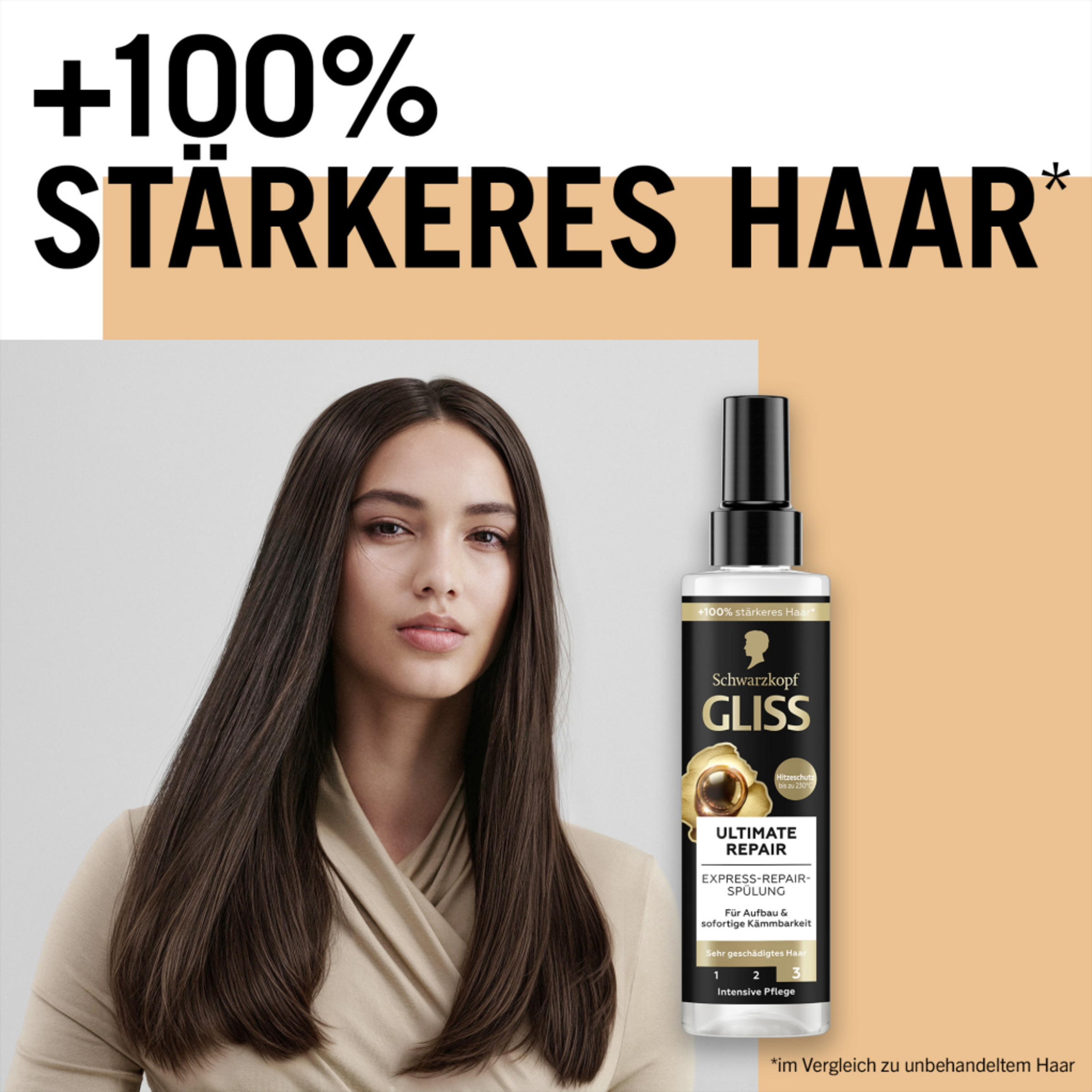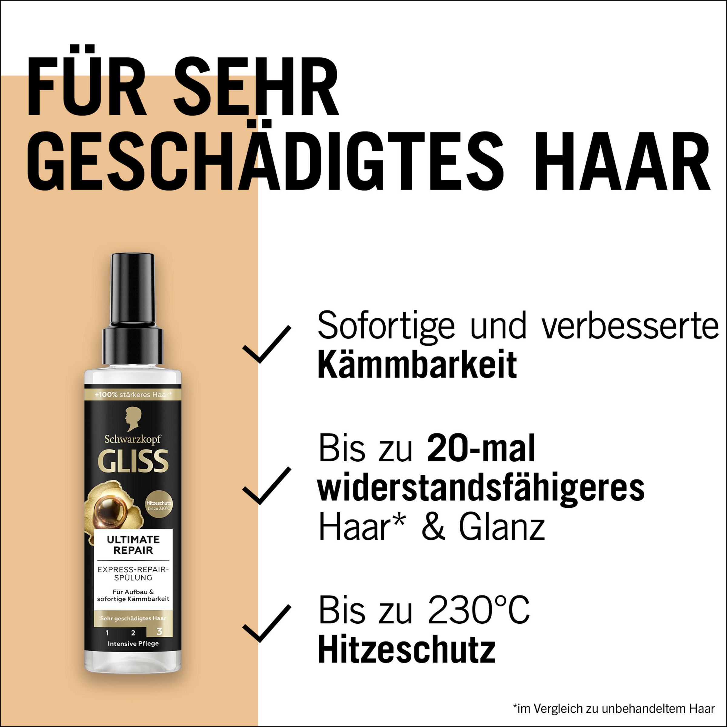 Extrem geschädigtes Haar verliert Keratin, wodurch die Haarstruktur stark geschwächt wird. Das Haar braucht eine extreme Reparatur-Pflege, die den Keratinbestand wieder auffüllt. Die Gliss Spülung enthält flüssiges Keratin und sorgt für eine Rekonstruktion der Haarstruktur. Haarschäden werden zielgenau repariert und der Keratinbestand wieder aufgefüllt. Die Sprühspülung bietet zudem einen Hitzeschutz bis zu 230 °C und bis zu 20 Mal mehr Widerstandskraft⁴ und Glanz.
