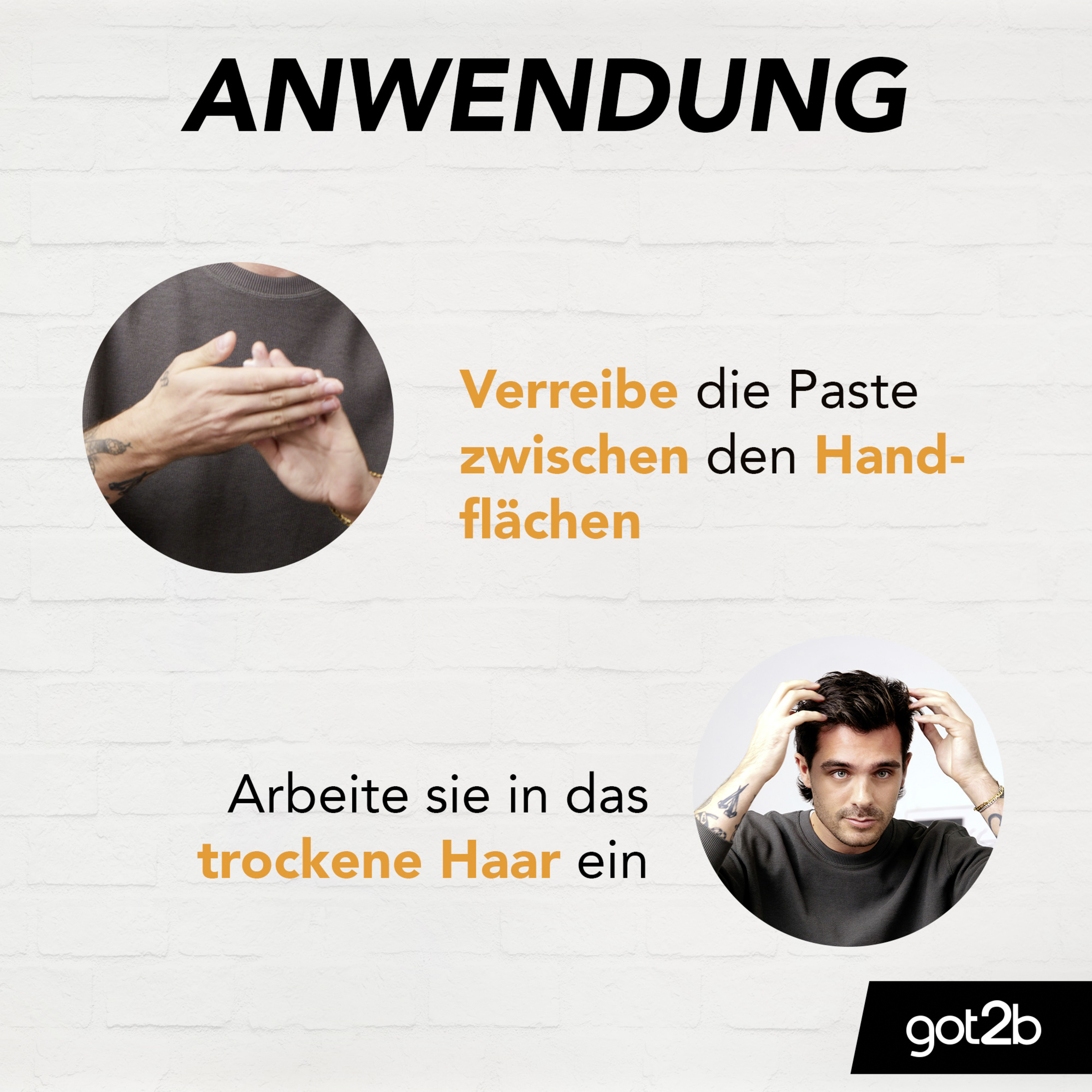 Verreibe die Clay-Paste zwischen deinen Handflächen und arbeite sie ins trockene Haar ein.