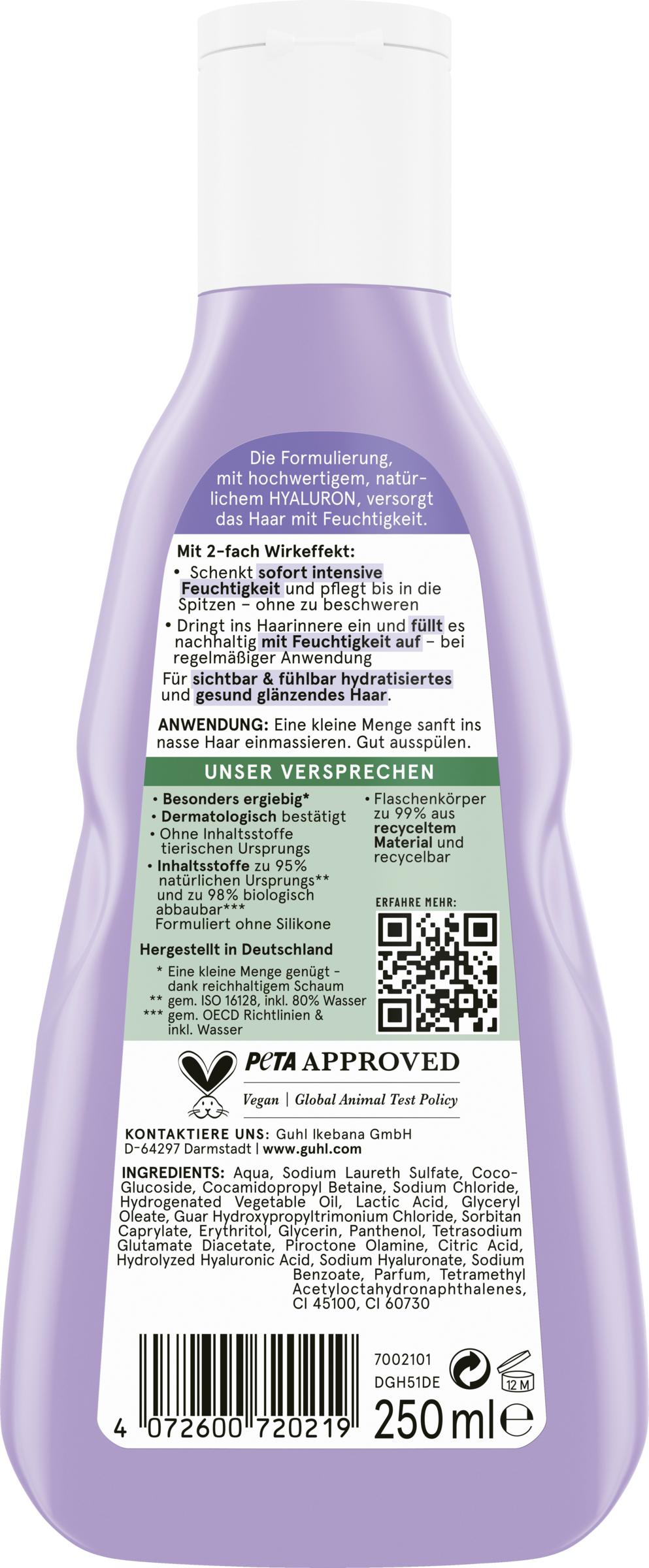 Trockenes und sprödes Haar verlangt nach einer besonderen Pflege, die es tiefenwirksam mit Feuchtigkeit versorgt, ohne es zu beschweren. Die Guhl Hyaluron⁺ Pflege Linie, bestehend aus Feuchtigkeits-Shampoo und Feuchtigkeits-Spülung, versorgt das Haar intensiv mit Feuchtigkeit und sorgt für schwerelos geschmeidiges Haar, das gesund glänzt. Der elegante Duft mit spritzigen Zitrusnoten, weißen Blüten und warmem Amber umhüllt das Haar und macht die Anwendung zu einem sinnlichen Pflegeerlebnis. Guhl Shampoos überzeugen durch ihre Qualität. Die Formulierungen sind sanft zur Kopfhaut, dermatologisch bestätigt und besonders ergiebig – dank des reichhaltigen, seidigen Schaums. Die Inhaltsstoffe des Hyaluron⁺ Pflege Feuchtigkeits-Shampoos sind zu 95% natürlichen Ursprungs* und zu 98% biologisch abbaubar **. Auf Silikone und tierische Inhaltsstoffe wird in den Formulierungen gänzlich verzichtet. Guhl stellt ihre Shampoos in Deutschland her und achten auch bei der Verpackung darauf, dass die Flaschenkörper zu 99% aus recyceltem Material bestehen und selbst recycelbar sind. Das ist unser Guhl Versprechen an die Welt.