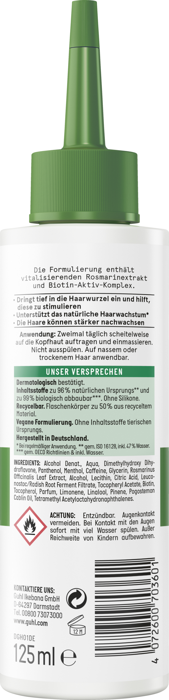 - vitalisierender Rosmarinextrakt & Biotin-Aktiv-Komplex: hilft erblich bedingten Haarausfall zu reduzieren bei regelmäßiger Anwendung