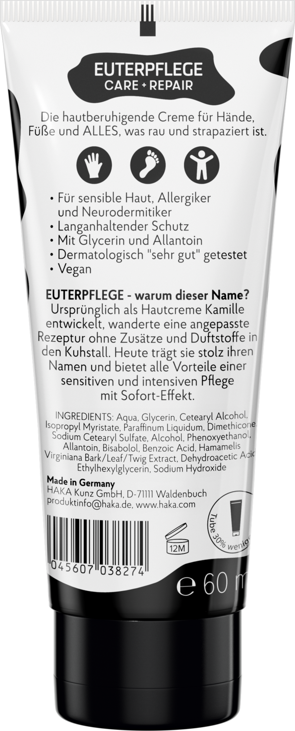 Die EUTERPFLEGE Creme ist eigentlich schon lange kein Geheimtipp mehr. Einzigartig ist nicht nur der Name, sondern auch die Rezeptur, die sich seit Jahrzehnten bewährt.Entwickelt wurde die Euterpflege ursprünglich für die beanspruchten Euter und Zitzen der Kühe. In leicht abgewandelter Rezeptur nimmt es die EUTERPFLEGE Creme heute auch mit besonders beanspruchter, sensibler und rauer Haut auf. Schon nach dem ersten Auftragen spürst du die wohltuende Wirkung.