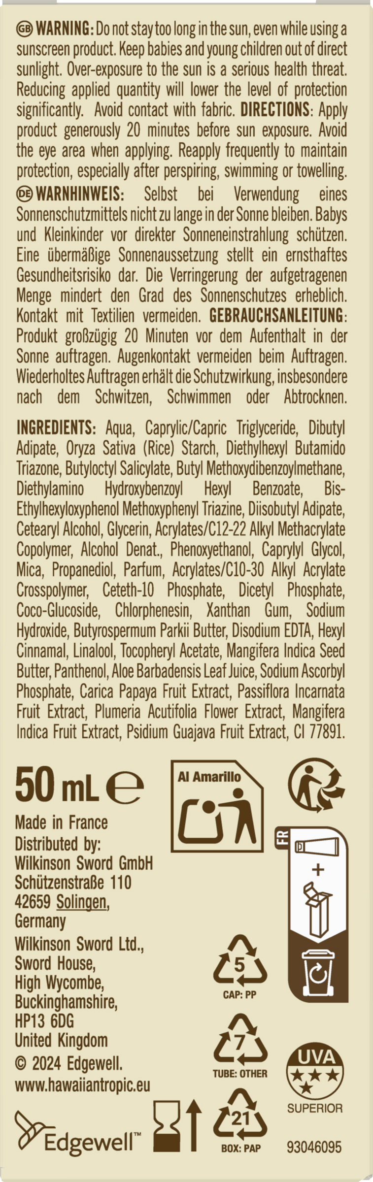 Aqua, Caprylic/Capric Triglyceride, Dibutyl Adipate, Oryza Sativa (Rice) Starch, Diethylhexyl Butamido Triazone, Butyloctyl Salicylate, Butyl Methoxydibenzoylmethane, Diethylamino Hydroxybenzoyl Hexyl Benzoate, Bis-Ethylhexyloxyphenol Methoxyphenyl Triazine, Diisobutyl Adipate, Cetearyl Alcohol, Glycerin, Acrylates/C12 22 Alkyl Methacrylate Copolymer, Alcohol Denat., Phenoxyethanol, Caprylyl Glycol, Mica, Propanediol, Parfum, Acrylates/C10 30 Alkyl Acrylate Crosspolymer, Ceteth 10 Phosphate, Dicetyl Phosphate, Coco Glucoside, Chlorphenesin, Xanthan Gum, Sodium Hydroxide, Butyrospermum Parkii Butter, Disodium EDTA, Hexyl Cinnamal, Linalool, Tocopheryl Acetate, Mangifera Indica Seed Butter, Panthenol, Aloe Barbadensis Leaf Juice, Sodium Ascorbyl Phosphate, Carica Papaya Fruit Extract, Passiflora Incarnata Fruit Extract, Plumeria Acutifolia Flower Extract, Mangifera Indica Fruit Extract, Psidium Guajava Fruit Extract, CI 77891.