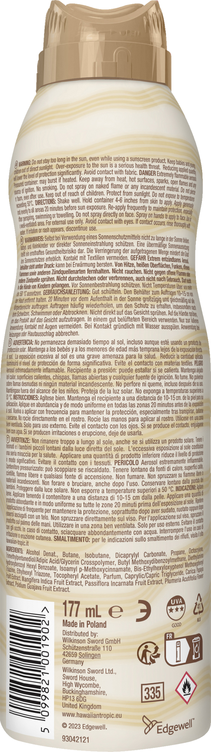 Alcohol Denat. Isobutane, Isododecene, Diisopropyl Adipate, Homosalate, Ethylhexyl Salicylate, Octocrylene, Butyl Methoxydibenzoylmethane, Dimethicone, VA/Butyl Maleate/Isobornyl Acrylate Copolymer, Parfum, Hydroxpropylcellulose, Paraffinum Liquidum, Ascorbyl Palmitate, Tocopherol Acetate, Panthenol, Aqua, Carica Papaya Fruit Extract, Colocasia Antiquorum Root Extract, Mangifera Indica Fruit Extract, Passiflora Incarnata Fruit Extract, Plumeria Acutifolia Flower Extract, Psidium Guajava Fruit Extract, Aloe Barbadensis Leaf Extract, Linalool, Hexyl Cinnemal, Butylphenyl Methylpropional, Limonene