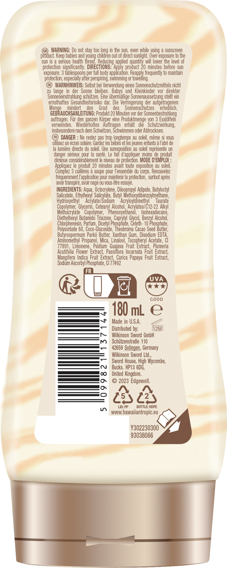 Schaffe unvergessliche Erinnerungen und schütze deine Haut gleichzeitig mit der einzigartigen Hawaiian Tropic Formel. Die Lotion mit LSF 30 und hohem UVA/UVB-Schutz ist genau das richtige für alle, die ihre Haut lieben. Die wasserfeste Lotion sorgt für langanhaltenden Genuss, egal wohin die Sonne dich entführt. Die Formel mit sichtbaren Feuchtigkeits-Streifen enthält hautpflegende Inhaltsstoffe wie Sheabutter und kombiniert auf innovative Weise fortschrittlichen Schutz mit 12h Feuchtigkeitszufuhr. Erlebe den Tag mit dem guten Gefühl von geschützter und gepflegter Haut und fühle dich wie umhüllt von der tropischen Essenz eines herrlichen Sommertages.