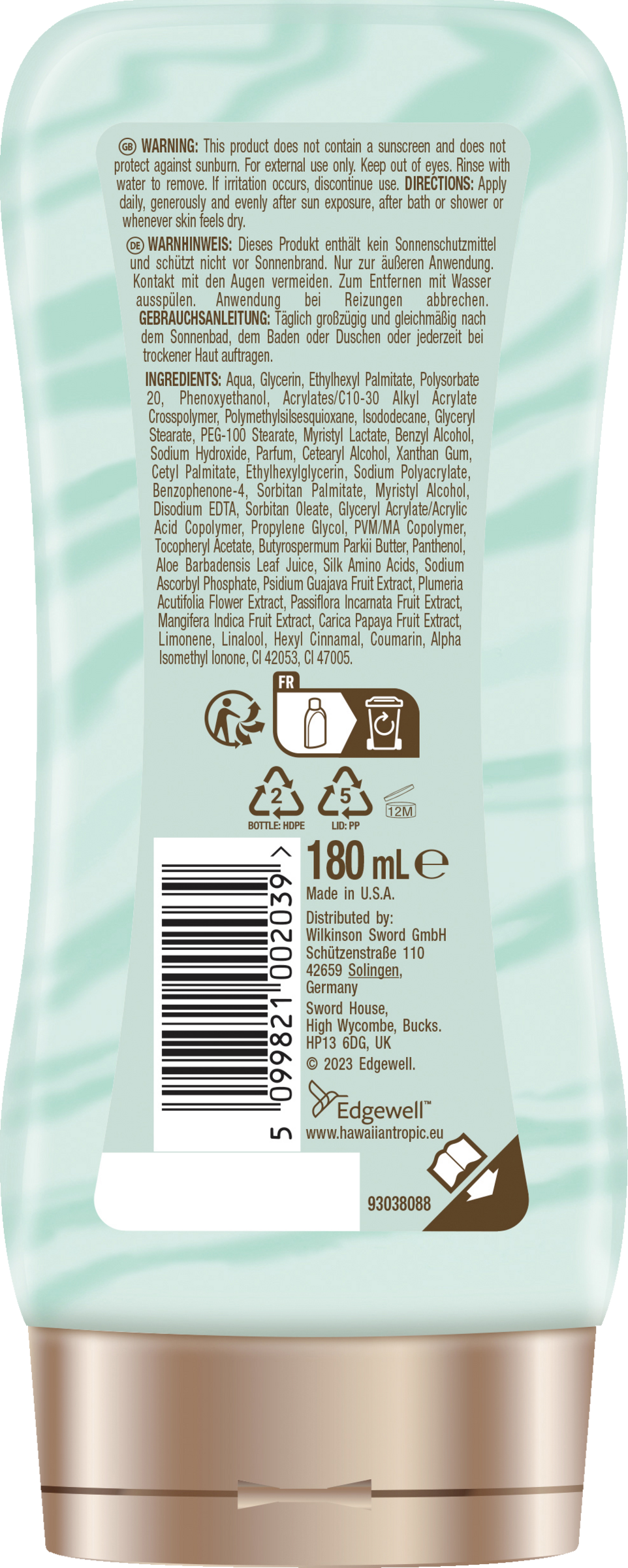 Dieses Produkt enthält kein Sonnenschutzmittel und schützt nicht vor Sonnenbrand. Nur zur äußeren Anwendung. Kontakt mit den Augen vermeiden. Zum Entfernen mit Wasser ausspülen. Anwendung bei Reizungen abbrechen.