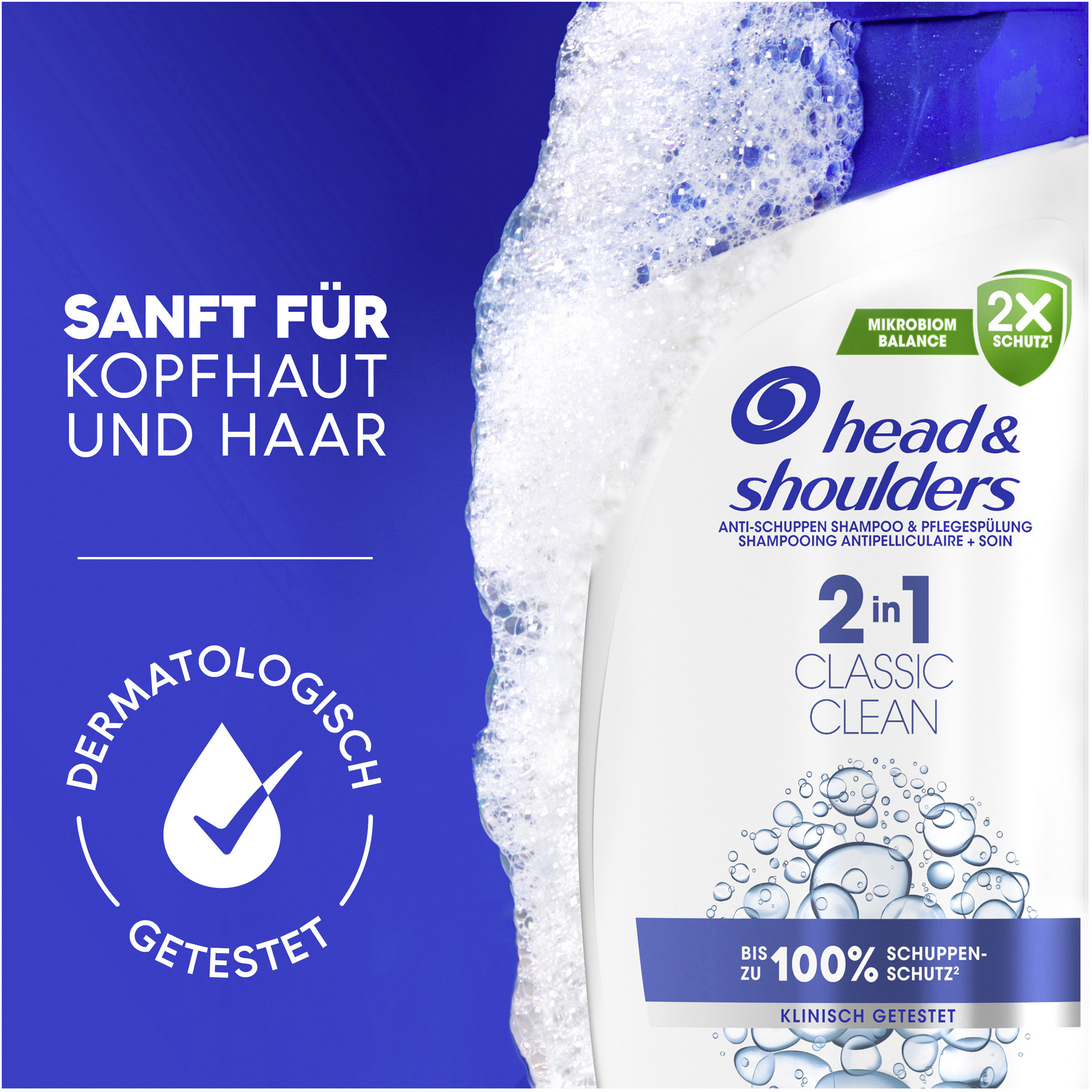 Head & Shoulders 2in1 Classic Clean Anti-Schuppen-Shampoo für jeden Haar- und Kopfhauttyp, wirksam selbst bei hartnäckigen Schuppen. Das Shampoo eignet sich zur täglichen Anwendung für Männer und Frauen, bekämpft mit der Mikrobiom-Balance-Formel gezielt die Ursache der Schuppen und sorgt für ein ausgewogenes Kopfhautmikrobiom. Durch das Freisetzen doppelt so vieler schützender Inhaltsstoffe ist es wirksam gegen sichtbare und unsichtbare Schuppen und verhindert porentief endgültig die Neubildung hartnäckiger Schuppen. Die 2in1 Shampoo-Formel enthält 25% mehr Pflegestoffe als andere Head & Shoulders Shampoos und die pH-neutrale Formel ist klinisch getestet sowie dermatologisch bestätigt.
