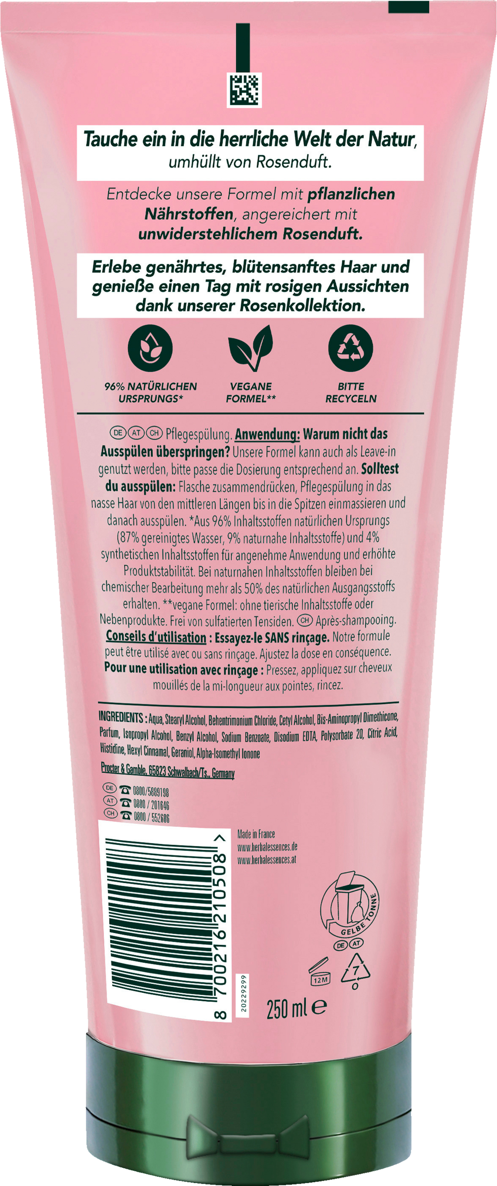 *wenn zusammen mit dem Rosen Shampoo verwendet**aus 96% Inhaltsstoffen natürlichen Ursprungs (87% gereinigtes Wasser, 9% naturnahe Inhaltsstoffe) und 4% synthetischen Inhaltsstoffen für angenehme Anwendung und erhöhte Produktstabilität. Bei naturnahen Inhaltsstoffen bleiben bei chemischer Bearbeitung mehr als 50% des natürlichen Ausgangsstoffs erhalten.