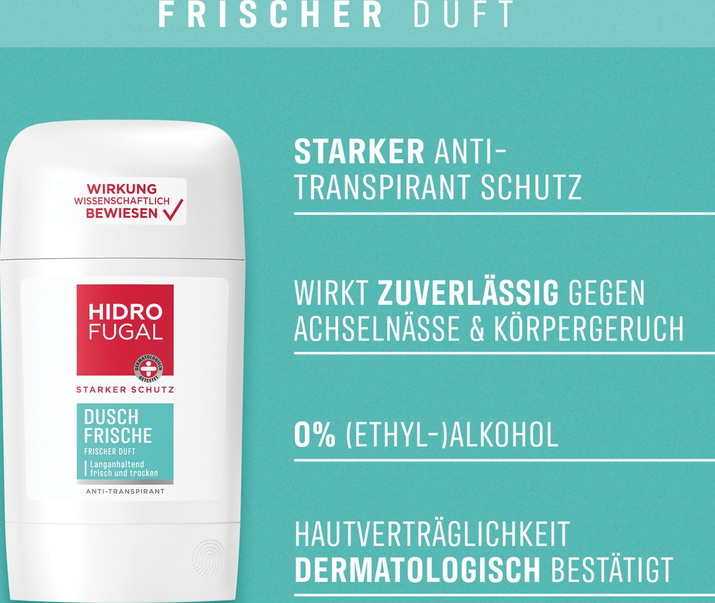 Für ein Gefühl wie frisch aus der Dusche: der HIDROFUGAL DUSCH FRISCHE Stick sorgt für angenehme Frische den ganzen Tag über. Zuverlässig stark im Schutz gegen Achselnässe und Körpergeruch und erfrischend im Duft dank der starken Anti-Transpirant Formel, dessen Wirkung wissenschaftlich bewiesen ist. Der belebende Duft verleiht ein langanhaltendes Gefühl von Sauberkeit und Frische.