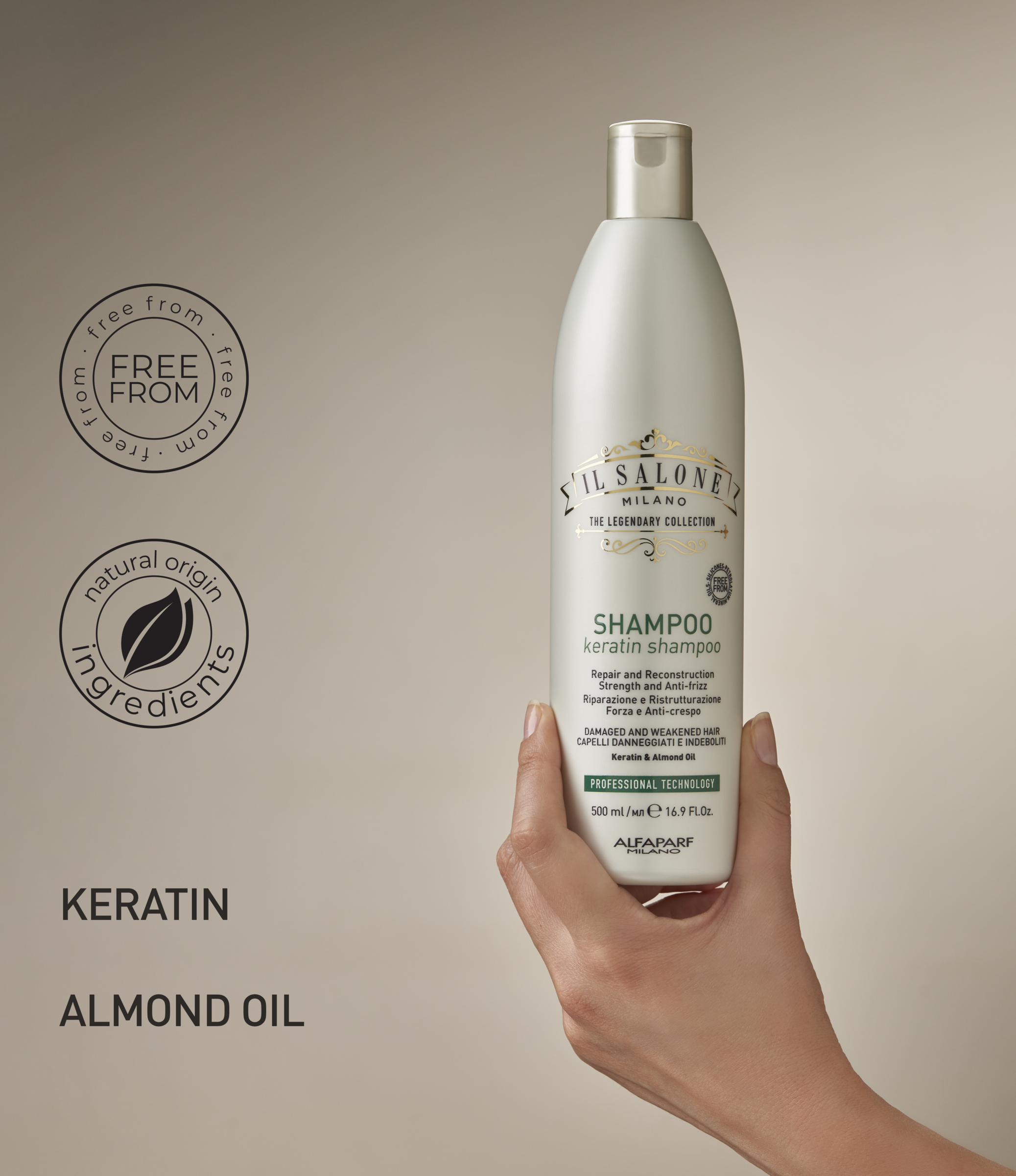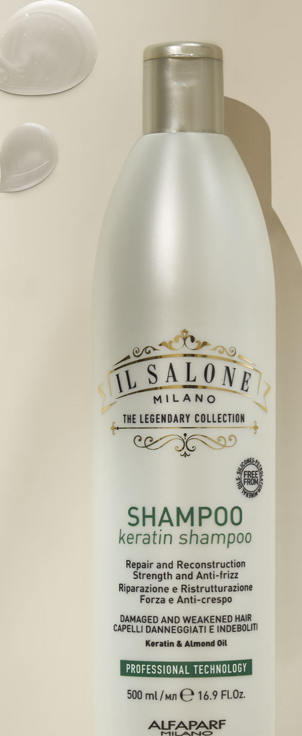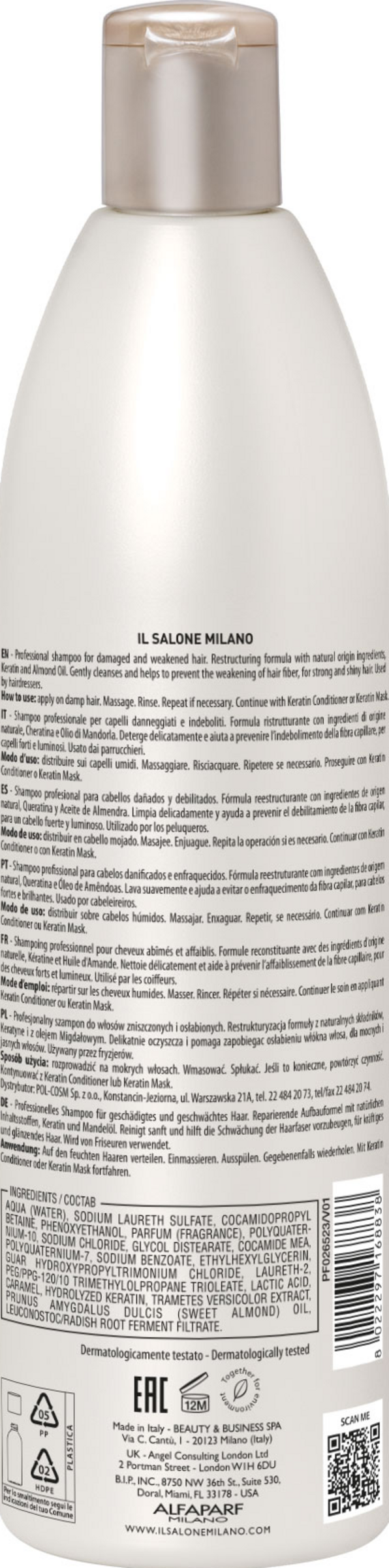 IL SALONE MILANO Keratin Shampoo. Professionelles Shampoo für geschädigtes und kraftloses Haar. Restrukturiende Formel mit Inhaltsstoffen natürlichen Ursprungs aus Italien. Es reinigt sanft und stärkt die Haarfaser. Angereichert mit Keratin, dass schützende und repariende Eigenschaften hat, und Mandelöl, dass das Haar pflegt und ihm Geschmeidigkeit verleiht. Für kräftiges und glänzendes Haar.