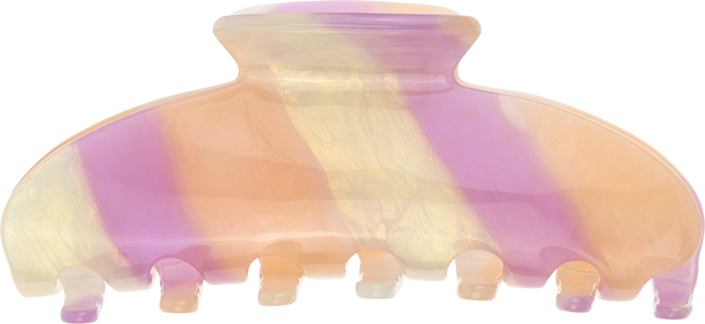Mit dem CLIPSTAR L Tricolor, einem großen Clip in leuchtenden Orange-, Lila- und Goldtönen, bringen Sie Ihre Frisur zum Strahlen. Ein mutiges und farbenfrohes Accessoire für auffällige Looks.