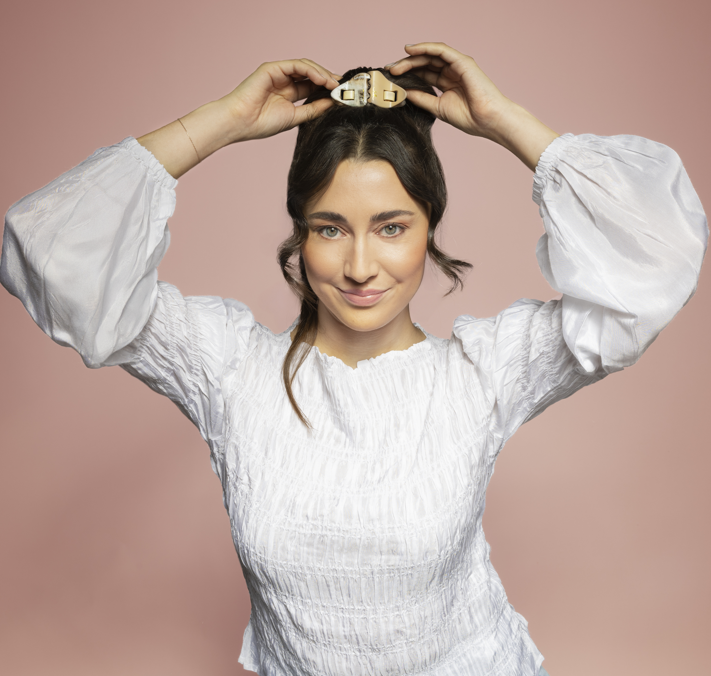 5. Anlegen: Setze die Spange an der gewünschten Stelle an und schiebe sie ins Haar.