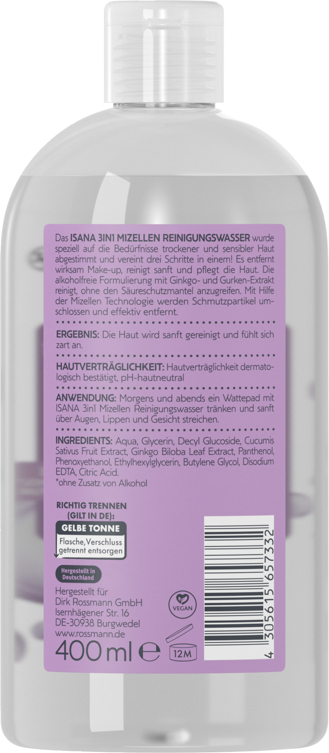Das ISANA 3 in 1 Mizellen Gesichtswasser wurde speziell auf die Bedürfnisse trockener und sensibler Haut abgestimmt und vereint drei Schritte in einem! Es entfernt wirksam Make-up, reinigt sanft und pflegt die Haut. Die alkoholfreie Formulierung mit Ginkgo- und Gurken-Extrakt reinigt, ohne den Säureschutzmantel anzugreifen. Mit Hilfe der Mizellen Technologie werden Schmutzpartikel umschlossen und effektiv entfernt.
