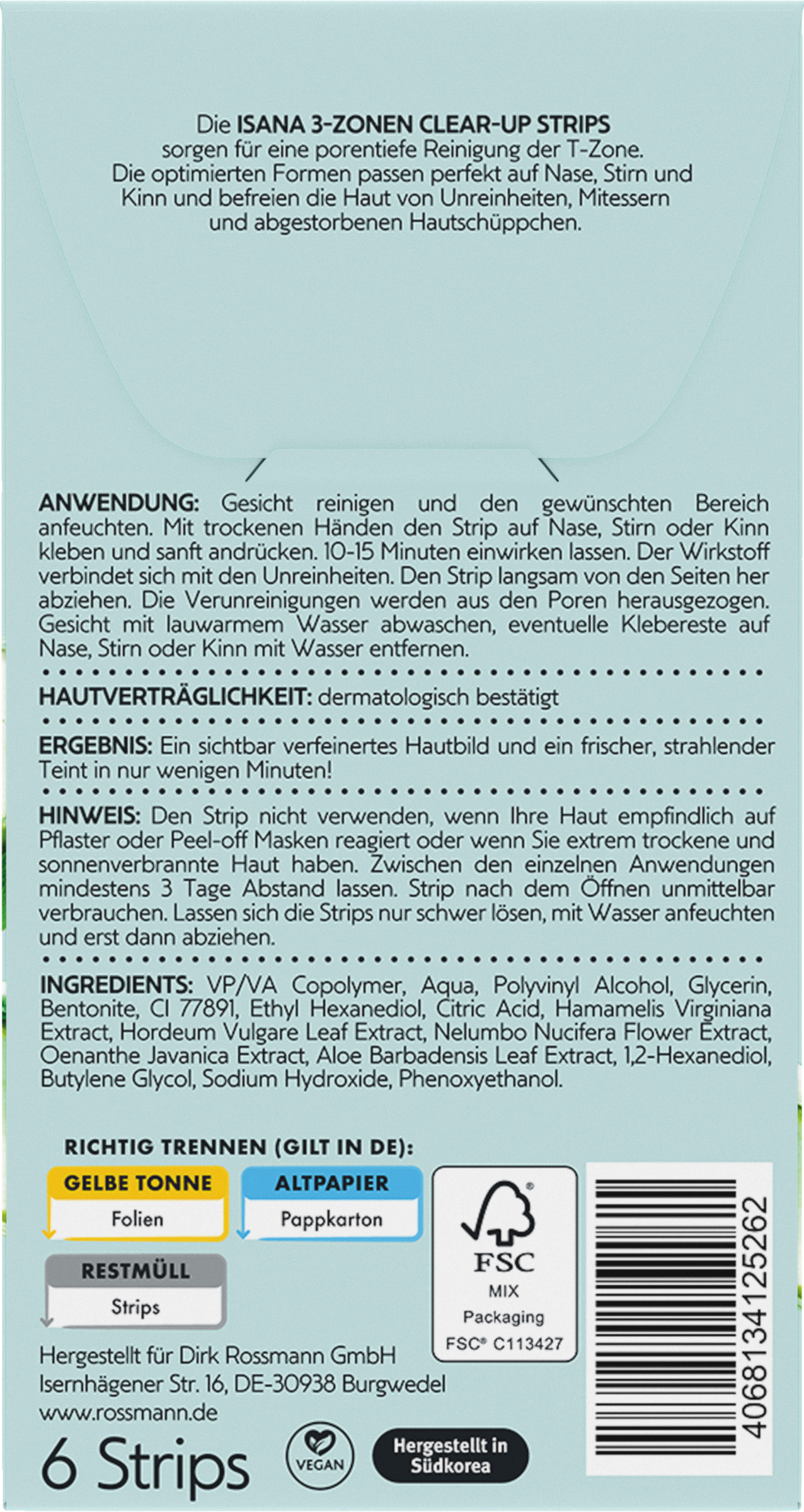 Die ISANA 3-ZONEN CLEAR-UP STRIPS sorgen für eine porentiefe Reinigung der T-Zone. Die optimierten Formen passen perfekt auf Nase, Stirn und Kinn und befreien die Haut von Unreinheiten, Mitessern und abgestorbenen Hautschüppchen.