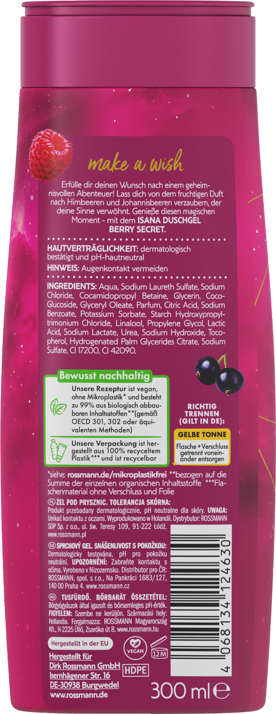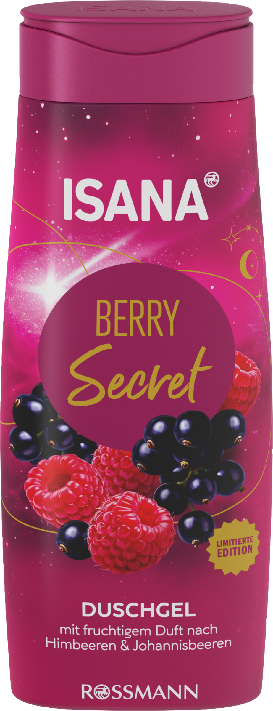 Erfülle dir deinen Wunsch nach einem geheimnisvollen Abenteuer! Lass dich von dem fruchtigen Duft nach Himbeeren und Johannisbeeren verzaubern, der deine Sinne verwöhnt. Genieße diesen magischen Moment - mit dem ISANA Duschgel Berry Secret.
