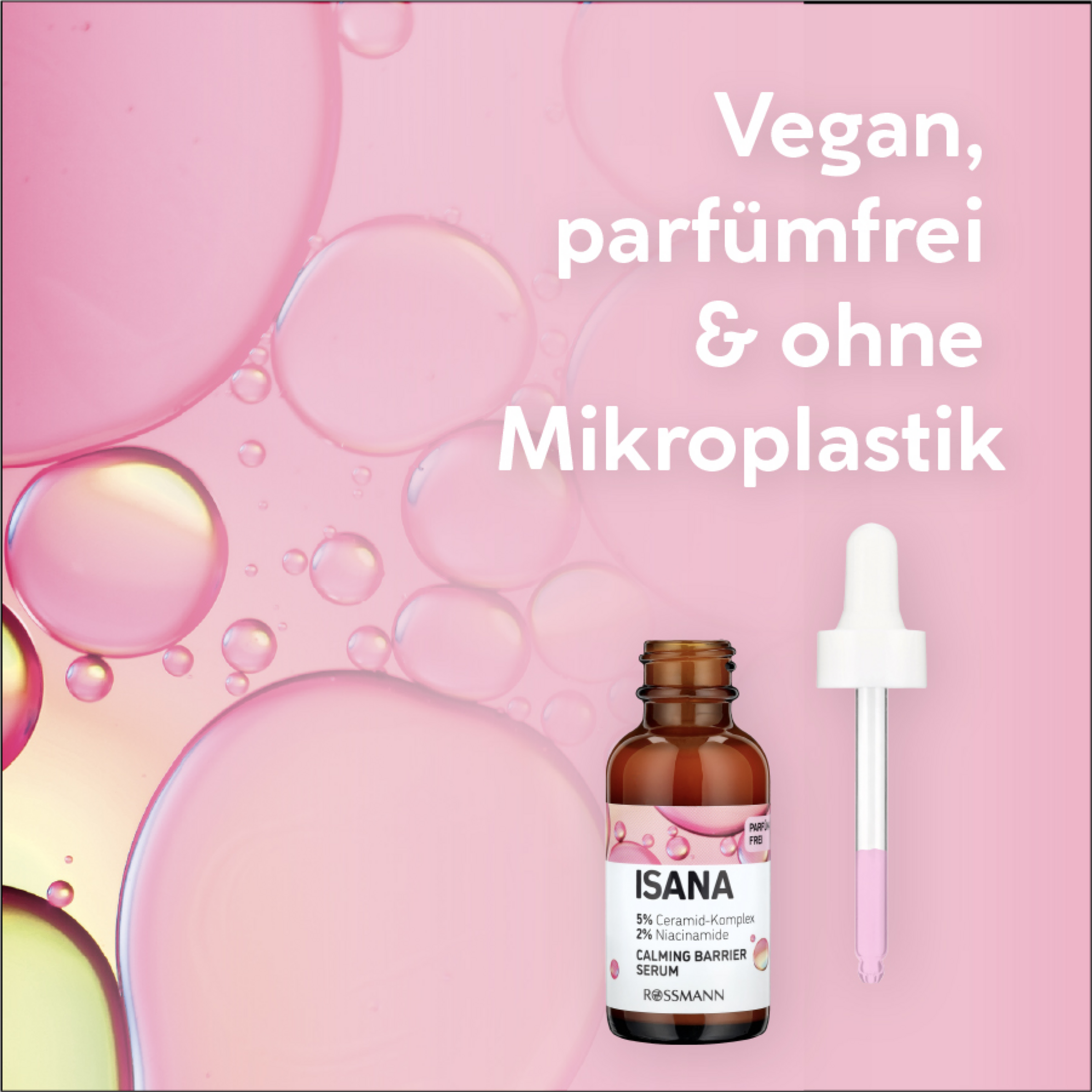 Das ISANA Calming Barrier Serum mit seiner hochwirksamen Pflegeformel stärkt die Hautschutzbarriere, beruhigt gestresste Haut und mildert Rötungen, Spannungsgefühle und Juckreiz. Die Haut wird mit intensiver Feuchtigkeit versorgt. Die Formulierung hinterlässt ein geschmeidiges und ebenmäßiges Hautbild.