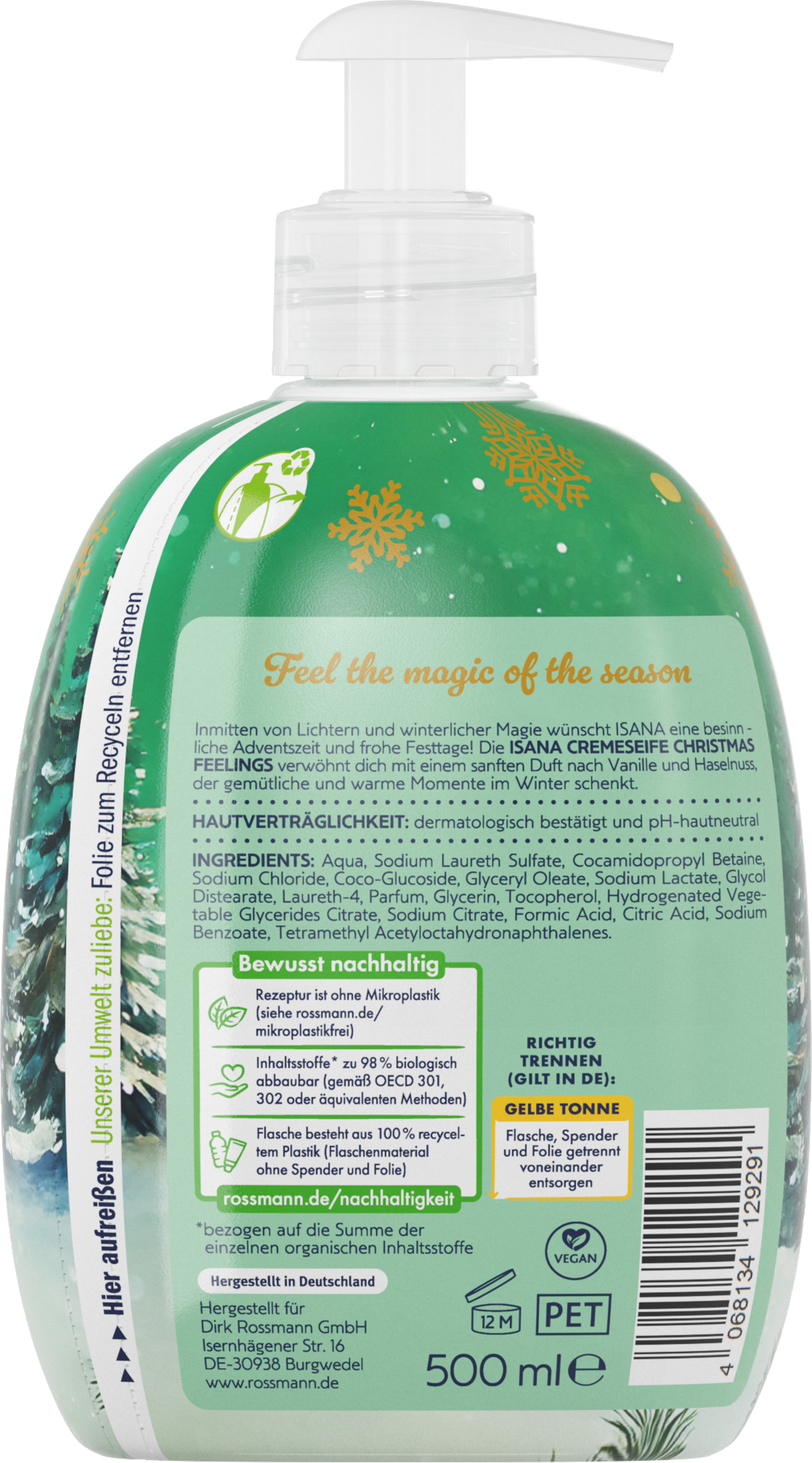 Inmitten von Lichtern und winterlicher Magie wünscht ISANA eine besinnliche Adventszeit und frohe Festtage! Die ISANA CREMESEIFE CHRISTMAS FEELINGS verwöhnt dich mit einem sanften Duft nach Vanille und Haselnuss, der gemütliche und warme Momente im Winter schenkt.
