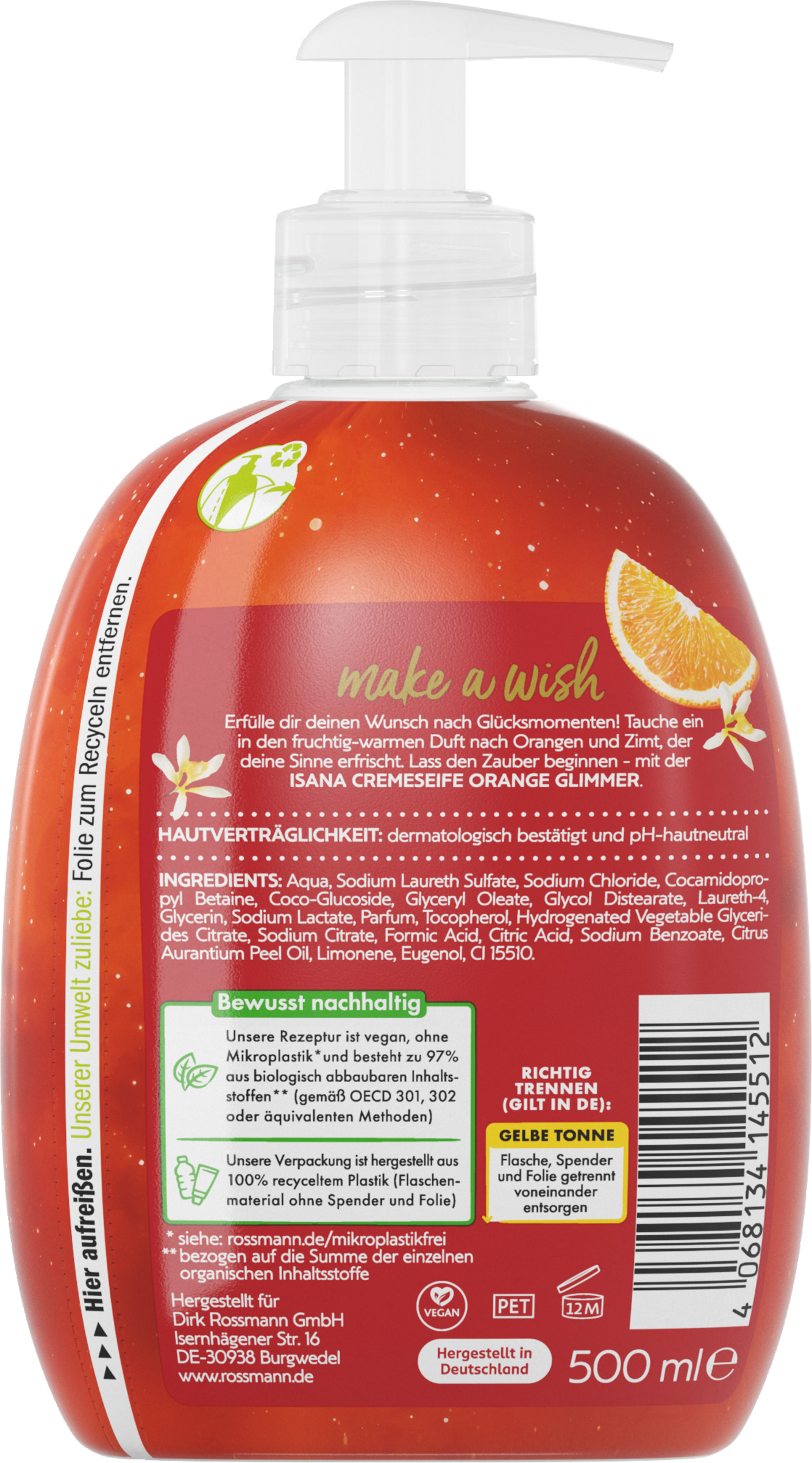 Tauche ein in den fruchtig-warmen Duft nach Orangen und Zimt, der deine Sinne erfrischt. Lass den Zauber beginnen - mit der ISANA CREMESEIFE ORANGE GLIMMER.