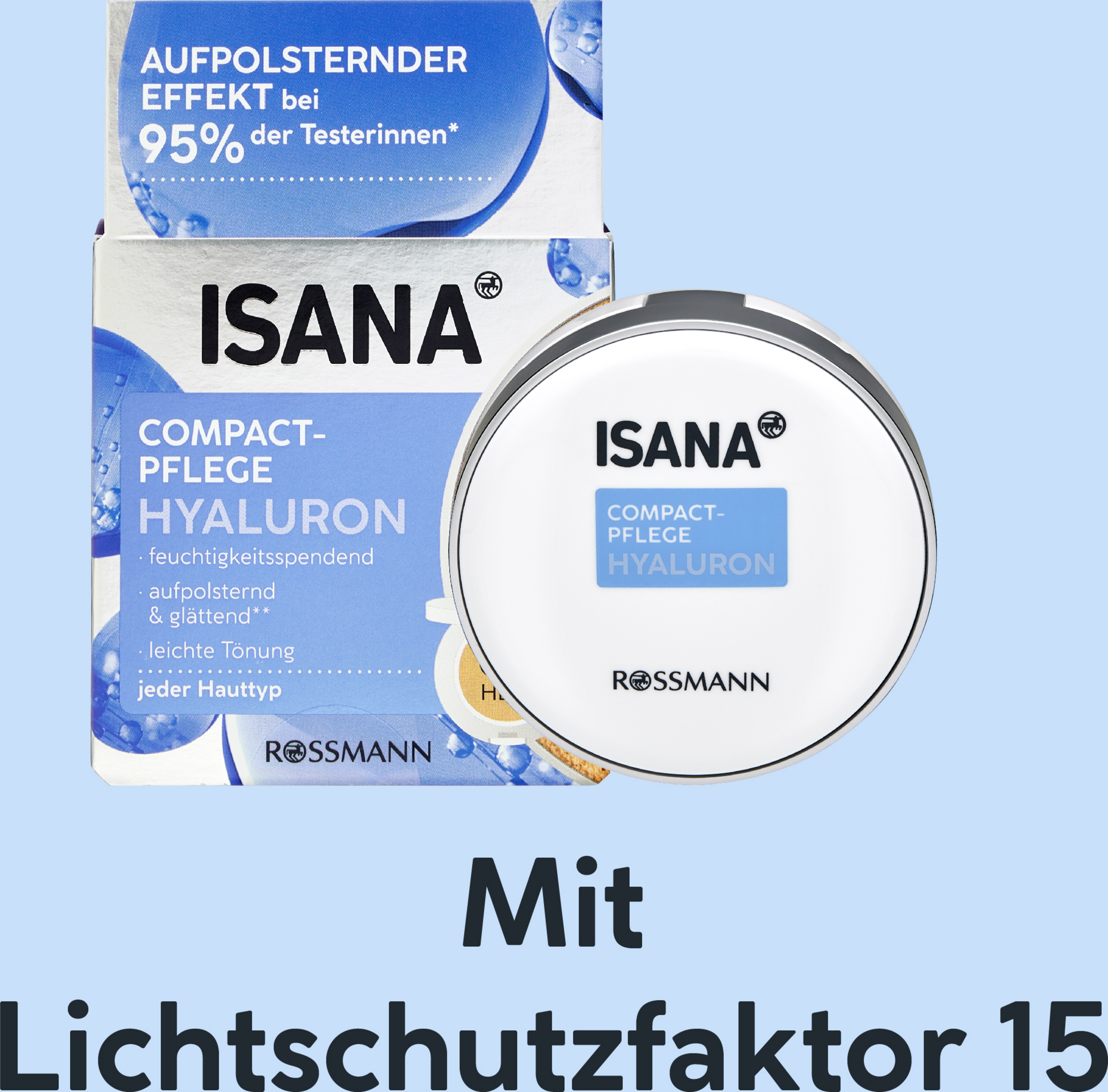 Die ISANA Hyaluron Compactpflege mit LSF 15 ist die perfekte Verbindung von Pflege und Make-up. Die innovative 3 in 1 Formel mit Hyaluronsäure hat einen aufpolsternden Effekt*, sorgt für einen strahlenden, natürlichen Teint, spendet Feuchtigkeit und reguliert den Feuchtigkeitsgehalt der Haut.