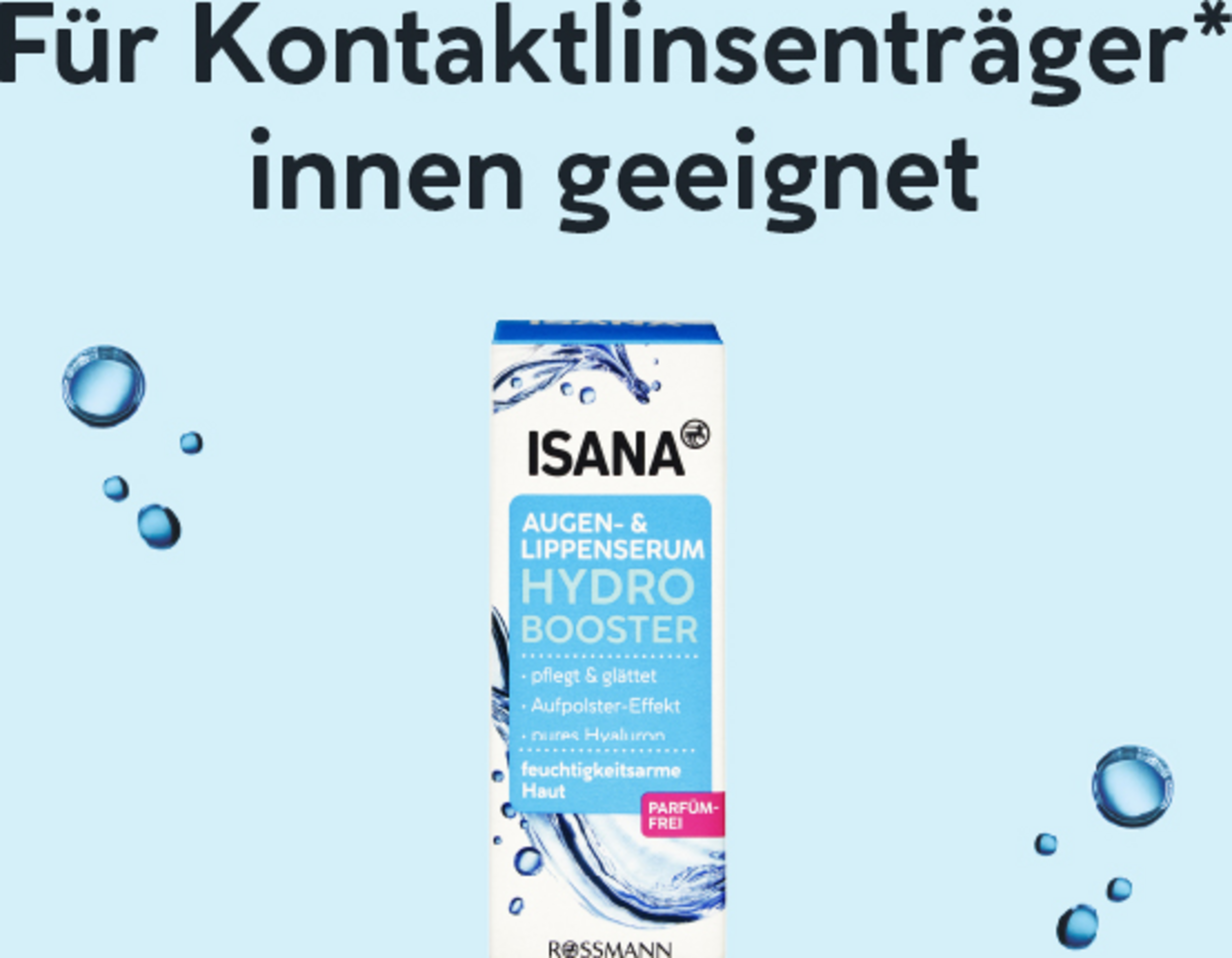 Verwöhnen Sie Ihre Haut mit dem ISANA HYDRO BOOSTER AUGEN- & LIPPENSERUM. Die leichte und schnell einziehende 24h Pflege hydratisiert sofort und intensiv mit Anti-Aging Effekt - für eine glattere Augenund Lippenpartie.WIRKUNG & PFLEGE: Pures Hyaluron, Aloe Vera und Kalpariane®, ein Algen-Extrakt aus der Bretagne, spenden intensive Feuchtigkeit und festigen die sensible Haut um Augen und Lippen. Das wertvolle zellschützende Vitamin E ist bekannt für seine Anti-Aging Wirkung. Es bewahrt die Haut zuverlässig und effektiv vor belastenden Umwelteinflüssen, wie freien Radikalen, die die Haut vorzeitig altern lassen können. Wertvolle Sheabutter regeneriert und pflegt zudem die Haut geschmeidig weichHAUTVERTRÄGLICHKEIT: dermatologisch und augenärztlich getestet und bestätigt. Für Kontaktlinsenträger*innen geeignetparfümfreiERGEBNIS: Das ISANA Hydro Booster Augen & Lippenserum glättet die Haut nachweislich im Bereich der Augen- und Lippenpartie. Nach 4 Wochen regelmäßiger Anwendung ist die Haut bei 85% der Testerinnen glatter.Diese Rezeptur ist zu 100% ohne Mikroplastik.