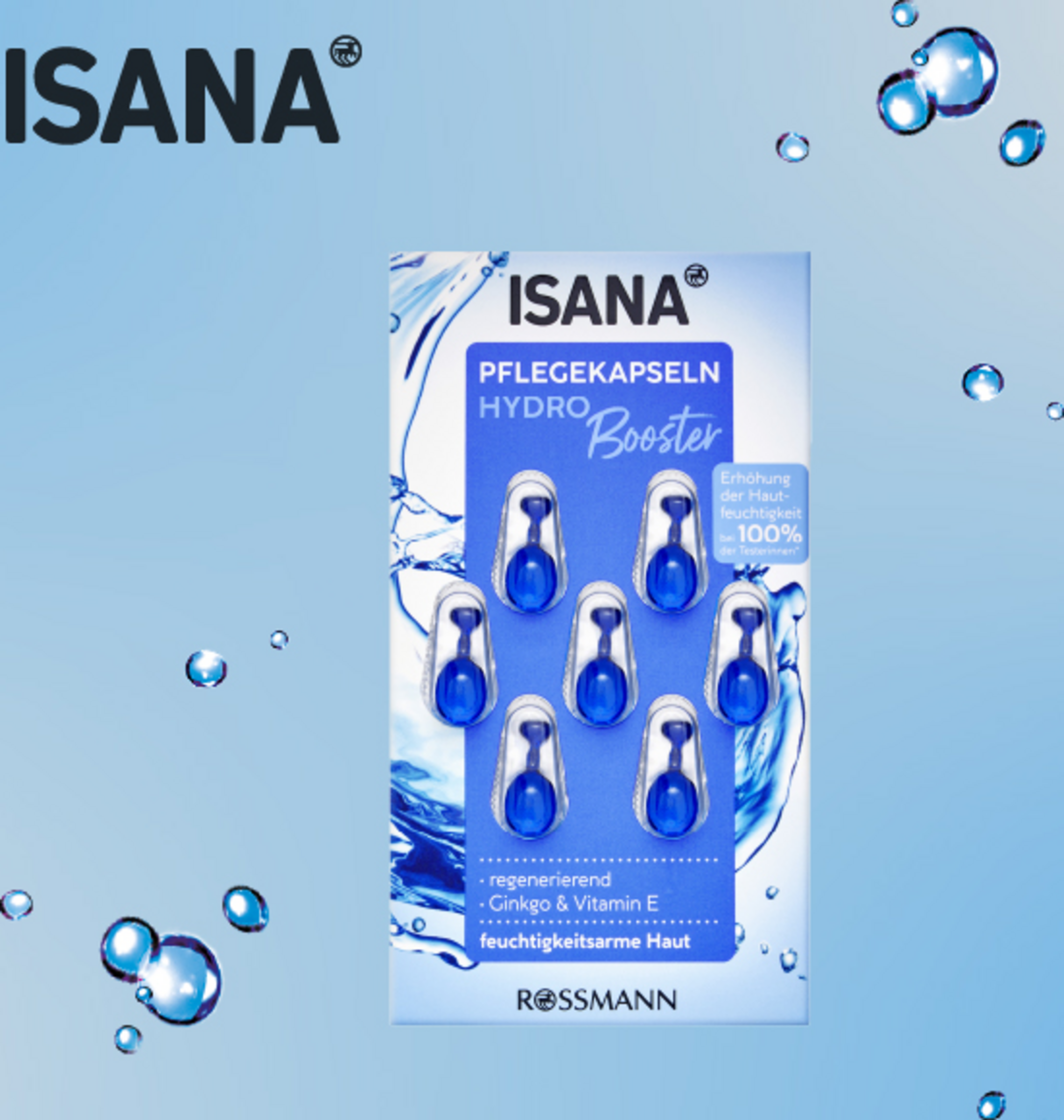 Ergebnis: Die ISANA Hydro Booster Pflegekapseln steigern den Feuchtigkeitsgehalt der Haut bei regelmäßiger Anwendung nachweislich bei 100% der Probandinnen*.