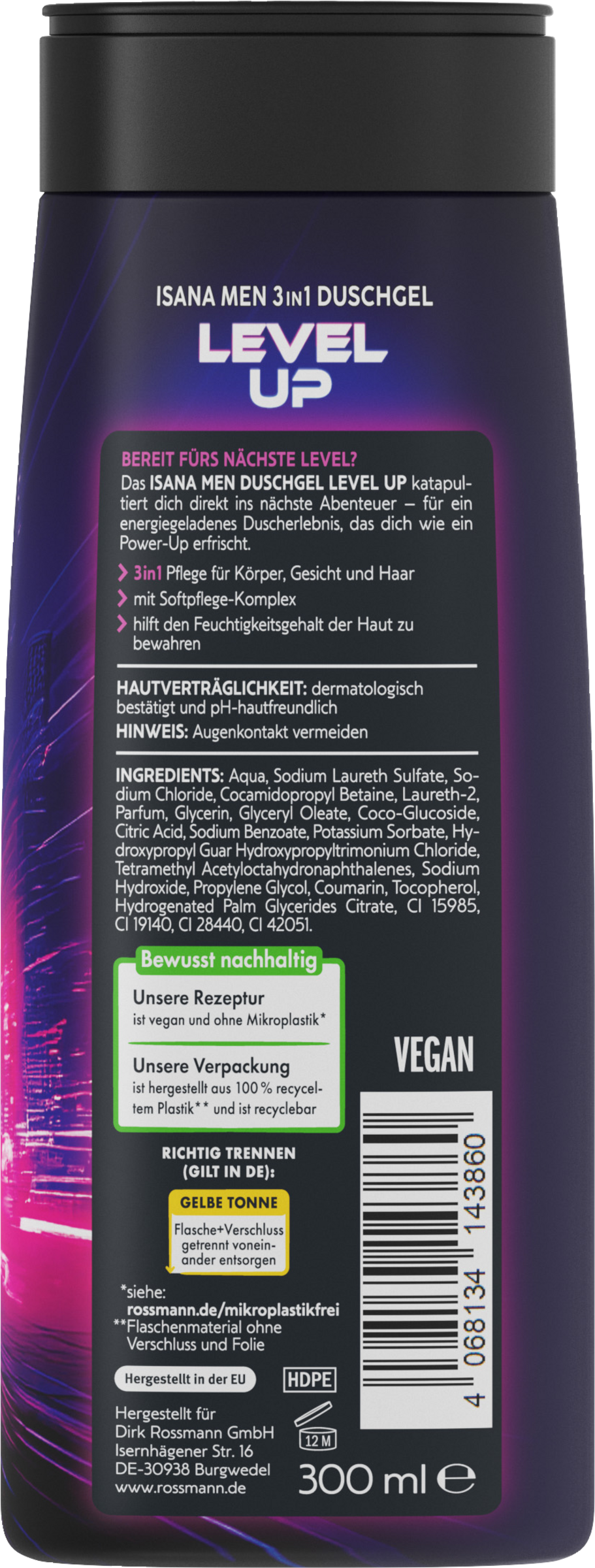 Das ISANA MEN DUSCHGEL LEVEL UP katapultiert dich direkt ins nächste Abenteuer – für ein energiegeladenes Duscherlebnis, das dich wie ein Power-Up erfrischt.