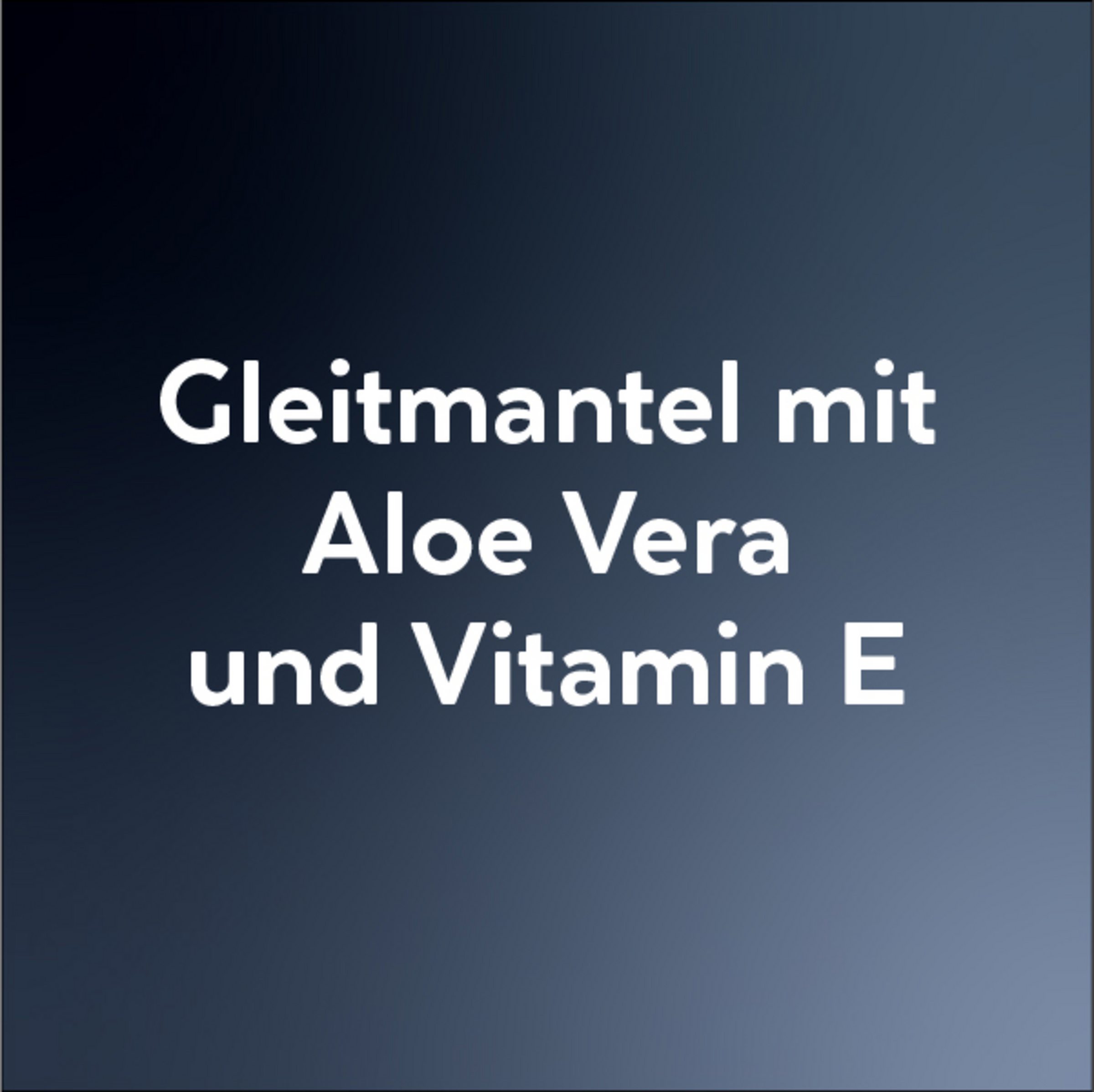 - Gleitmantel mit Aloe Vera und Vitamin E erleichtert das Gleiten des Rasierers auf der Haut