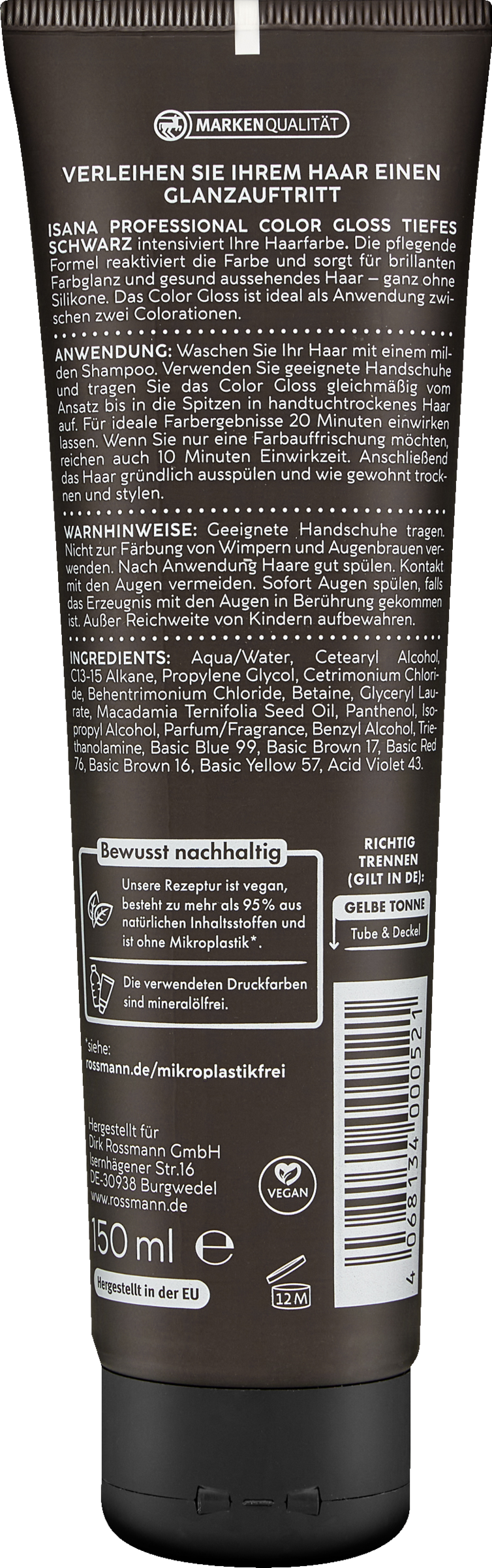 Verleiht dem Haar einen Glanzauftritt - ISANA Professional Color Gloss Tiefes Schwarz intensiviert Ihre Haarfarbe. Die pflegende Formel reaktiviert die Farbe und sorgt für brillanten Farbglanz und gesund aussehendes Haar – ganz ohne Silikone. Das Color Gloss ist ideal als Anwendung zwischen zwei Colorationen.