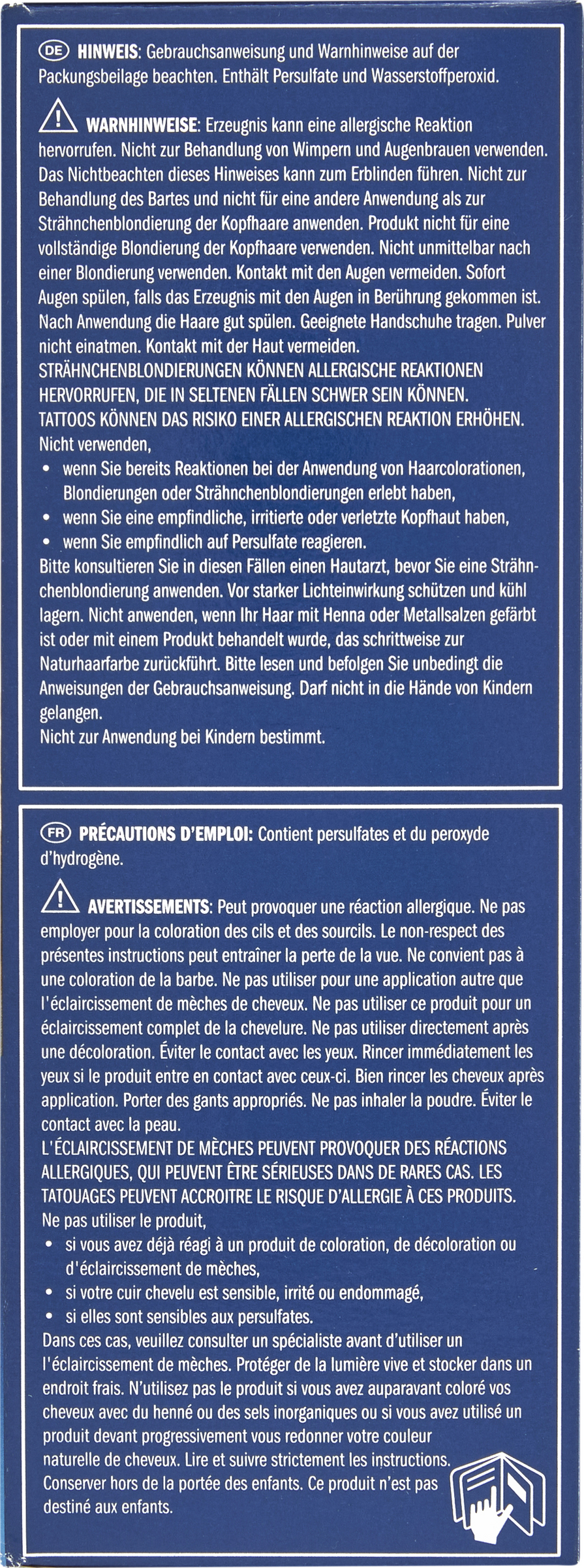 Enthält Persulfate und Wasserstoffperoxid.Erzeugnis kann eine allergische Reaktion hervorrufen. Nicht zur Behandlung von Wimpern und Augenbrauen verwenden. Das Nichtbeachten dieses Hinweises kann zum Erblinden führen. Nicht zur Behandlung des Bartes und nicht für eine andere Anwendung als zur Stränchenblondierung der Kopfhaare anwenden. Produkt nicht für eine vollständige Blondierung der Kopfhaare verwenden.Nicht unmittelbar nach einer Blondierung verwenden. Kontakt mit den Augen vermeiden. Sofort Augen spülen, falls das Erzeugnis mit den Augen in Berührung gekommen ist. Nach Anwendung die Haare gut spülen. Geeignete Handschuhe tragen, Pulver nicht einatmen. Kontakt mit der Haut vermeiden.STRÄHNCHENBLONDIERUNGEN KÖNNEN ALLERGISCHE REAKTIONEN HERVORRUFEN,DIE IN SELTENEN FÄLLEN SCHWER SEIN KÖNNEN. TATTOOS KÖNNEN DAS RISIKO EINER ALLERGISCHEN REAKTION ERHÖHEN.Nicht verwenden,