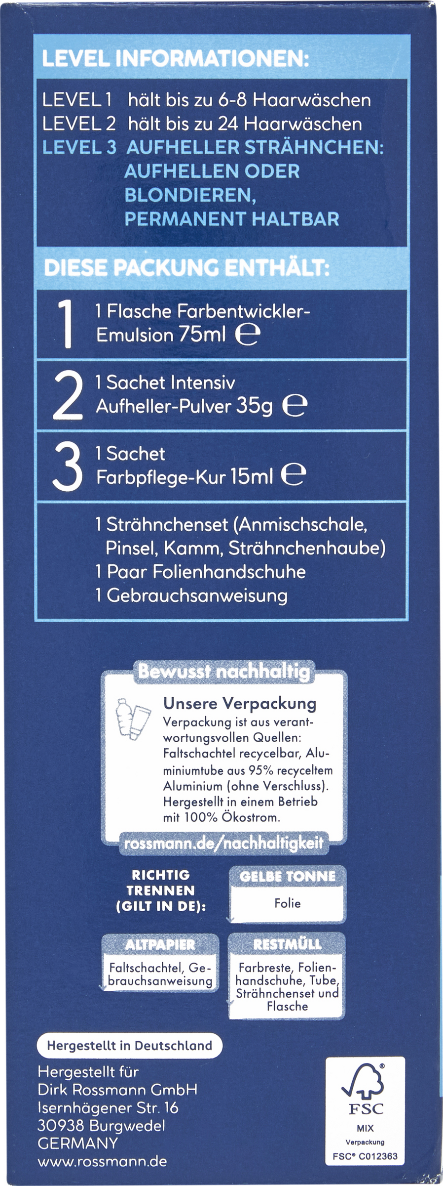 Bitte konsultieren Sie in diesen Fällen einen Hausarzt, bevor Sie eine Strähnchenblondierung anwenden.Nicht anwenden, wenn Ihr Haar mit Henna oder Metallsalzen gefärbt ist oder mit einem Produkt behandelt wurde, das schrittweise zur Naturhaarfarbe zurückführt. Bitte lesen und befolgen Sie unbedingt die Anweisungen der Gebrauchsanweisung.Darf nicht in die Hände von Kindern gelangen. Nicht zur Anwendung bei Kindern bestimmt.