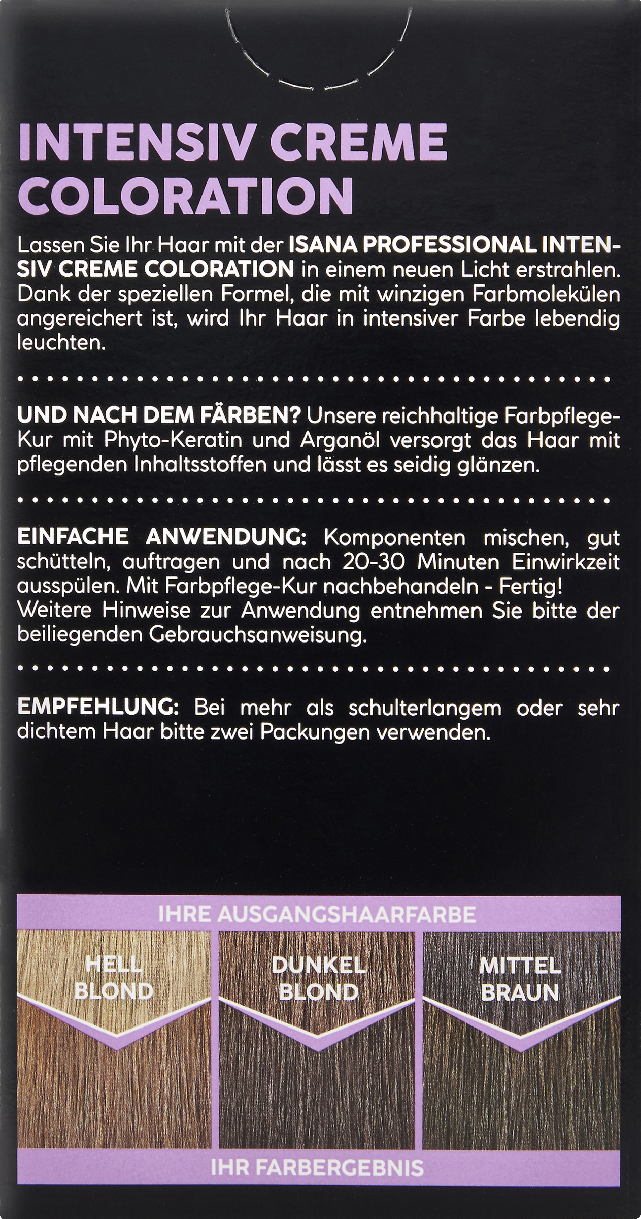Lassen Sie Ihr Haar mit der ISANA PROFESSIONAL INTENSIV CREME COLORATION in einem neuen Licht erstrahlen. Dank der speziellen Formel, die mit winzigen Farbmolekülen angereichert ist, wird Ihr Haar in intensiver Farbe lebendig leuchten.