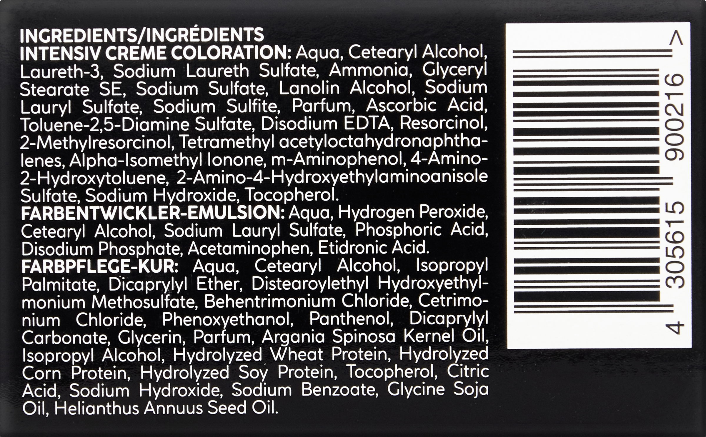 - INTENSIV CREME COLORATION: Aqua, Cetearyl Alcohol, Laureth-3, Sodium Laureth Sulfate, Ammonia, Glyceryl Stearate SE, Sodium Sulfate, Lanolin Alcohol, Sodium Lauryl Sulfate, Sodium Sulfite, Parfum, Ascorbic Acid, Toluene-2,5-Diamine Sulfate, Disodium EDTA, Resorcinol, 2-Methylresorcinol, Alpha-Isomethyl Ionone, Geraniol, Citronellol, Limonene, m-Aminophenol, 4-Amino-2-Hydroxytoluene, 2-Amino-4-Hydroxyethylaminoanisole Sulfate, Sodium Hydroxide, Tocopherol.