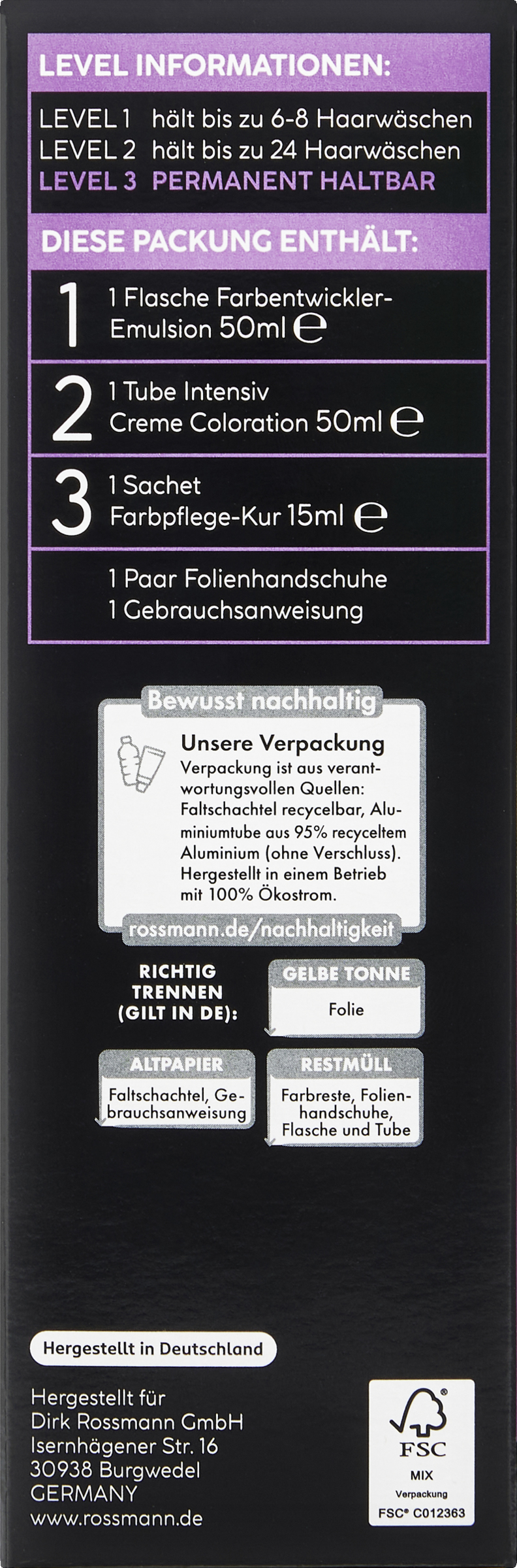 - Inhalt: 1 Flasche Farbentwickler-Emulsion (50 ml), 1 Paar Folienhandschuhe, 1 Gebrauchsanweisung, 1 Tube Intensiv Creme Coloration (50 ml), 1 Sachet Farbpflege-Kur (15 ml)