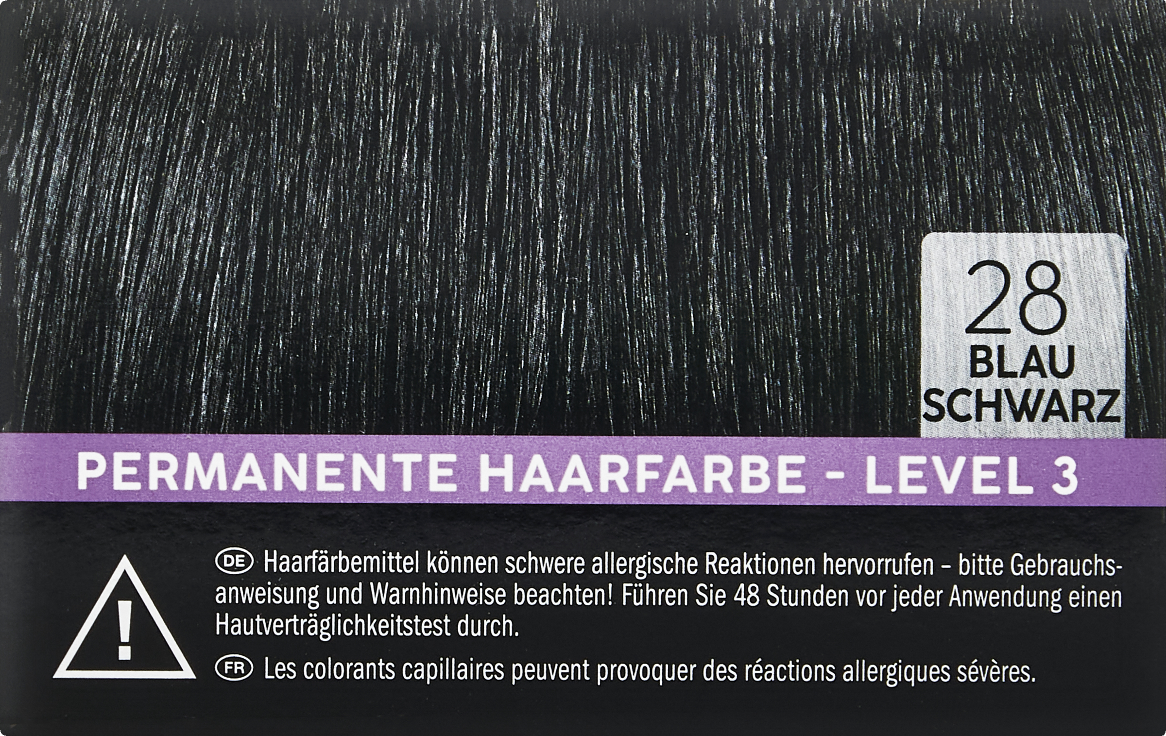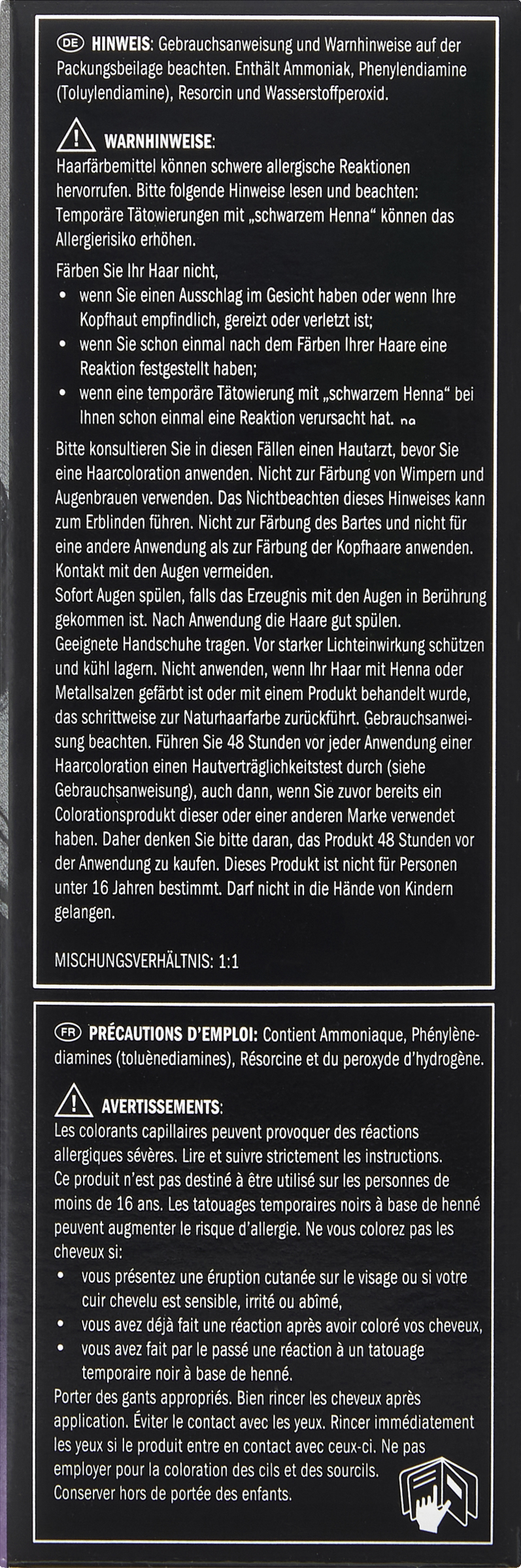 Gebrauchsanweisung und Warnhinweise auf der Packungsbeilage beachten. Enthält Ammoniak, Phenylendiamine (Toluylendiamine), Resorcin und Wasserstoffperoxid. Haarfärbemittel können schwere allergische Reaktionen hervorrufen. Bitte folgende Hinweise lesen und beachten: Temporäre Tätowierungen mit „schwarzem Henna“ können das Allergierisiko erhöhen. Färben Sie Ihr Haar nicht,