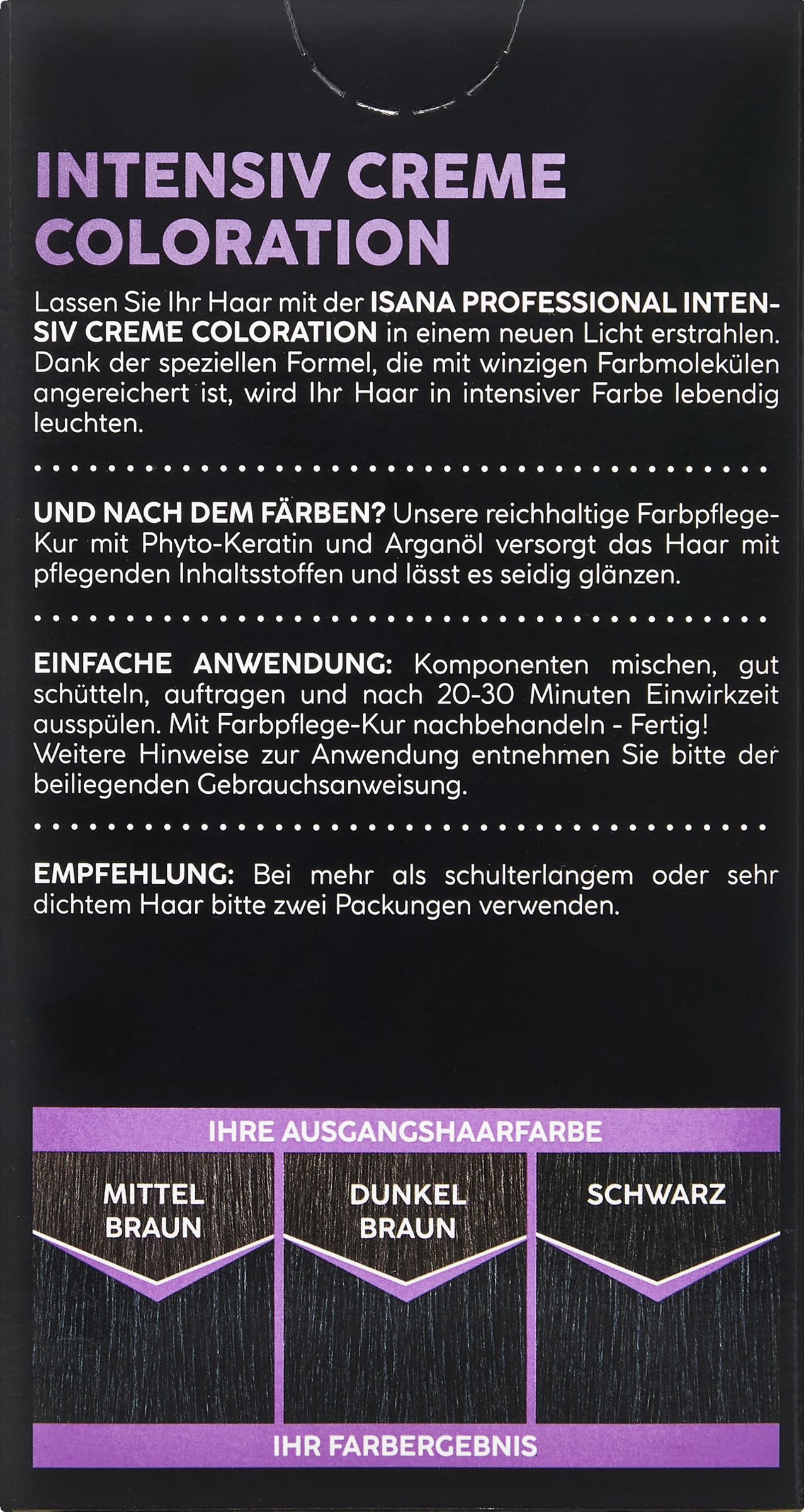 Lassen Sie Ihr Haar mit der ISANA PROFESSIONAL INTENSIV CREME COLORATION in einem neuen Licht erstrahlen. Dank der speziellen Formel, die mit winzigen Farbmolekülen angereichert ist, wird Ihr Haar in intensiver Farbe lebendig leuchten.