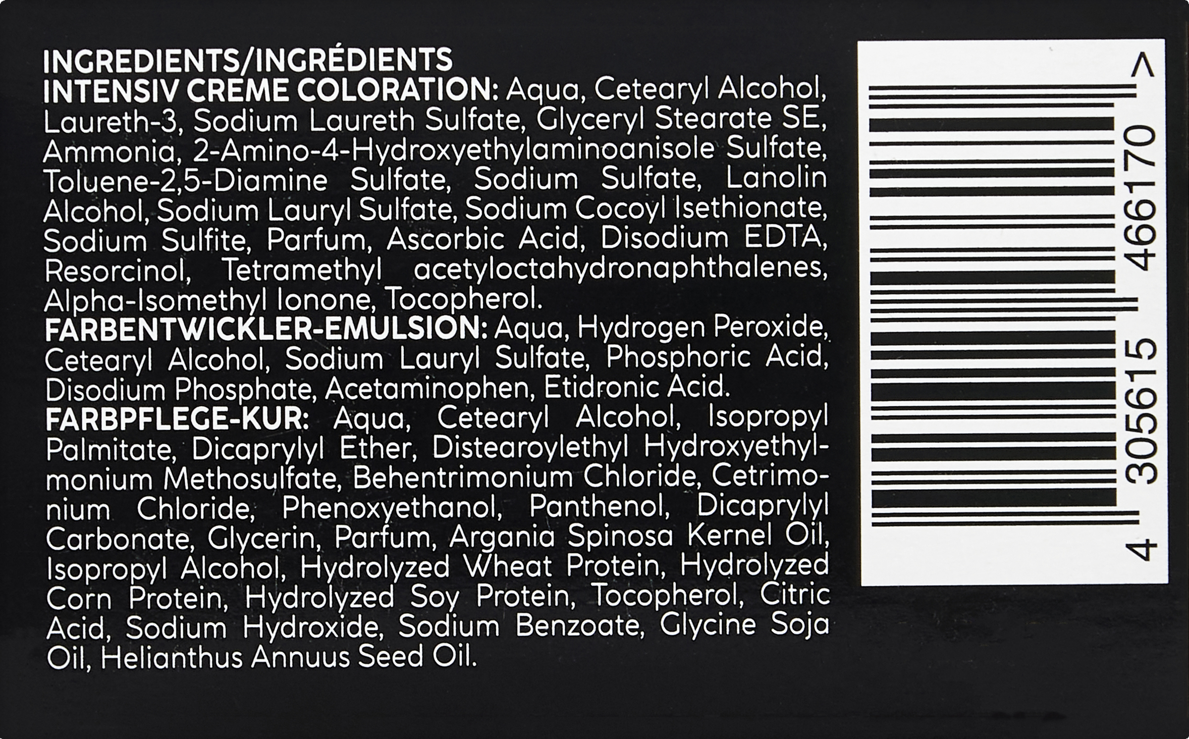 - INTENSIV CREME COLORATION: Aqua, Cetearyl Alcohol, Laureth-3, Sodium Laureth Sulfate, Glyceryl Stearate SE, Ammonia, 2-Amino-4-Hydroxyethylaminoanisole Sulfate, Toluene-2,5-Diamine Sulfate, Sodium Sulfate, Lanolin Alcohol, Sodium Lauryl Sulfate, Sodium Cocoyl Isethionate, Sodium Sulfite, Parfum, Ascorbic Acid, Disodium EDTA, Resorcinol, Tetramethyl acetyloctahydronaphthalenes, Alpha-Isomethyl Ionone, Tocopherol.