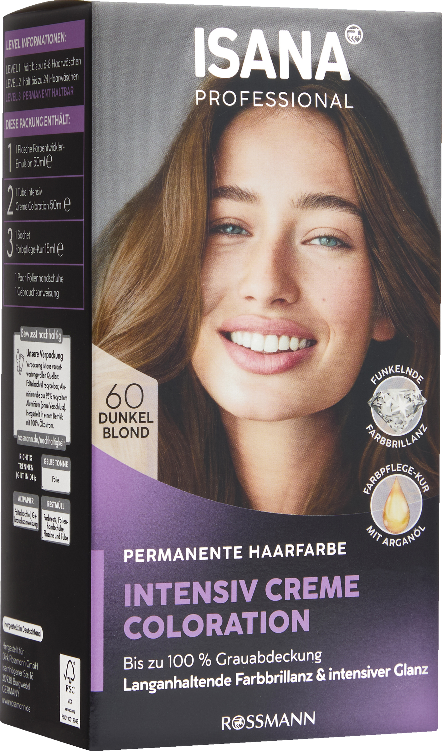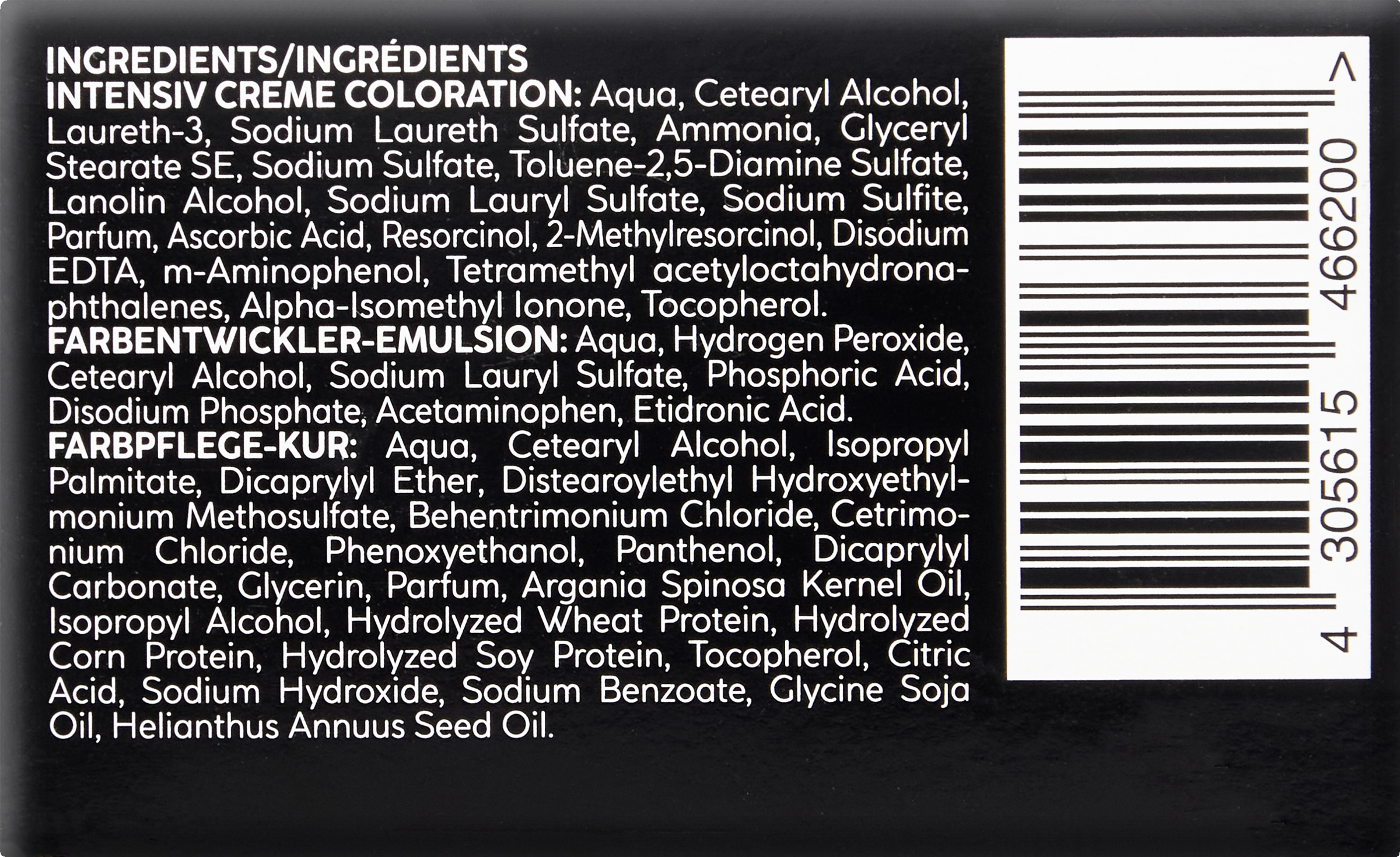 INTENSIV CREME COLORATION: Aqua, Cetearyl Alcohol, Laureth-3, Sodium Laureth Sulfate, Ammonia, Glyceryl Stearate SE, Sodium Sulfate, Toluene-2,5-Diamine Sulfate, Lanolin Alcohol, Sodium Lauryl Sulfate, Sodium Sulfite, Parfum, Ascorbic Acid, Resorcinol, 2-Methylresorcinol, Disodium EDTA, m-Aminophenol, Tetramethyl acetyloctahydronaphthalenes, Alpha-Isomethyl Ionone, Tocopherol. FARBENTWICKLER-EMULSION: Aqua, Hydrogen Peroxide, Cetearyl Alcohol, Sodium Lauryl Sulfate, Phosphoric Acid, Disodium Phosphate, Acetaminophen, Etidronic Acid. FARBPFLEGE-KUR: Aqua, Cetearyl Alcohol, Isopropyl Palmitate, Dicaprylyl Ether, Distearoylethyl Hydroxyethylmonium Methosulfate, Behentrimonium Chloride, Cetrimonium Chloride, Phenoxyethanol, Panthenol, Dicaprylyl Carbonate, Glycerin, Parfum, Argania Spinosa Kernel Oil, Isopropyl Alcohol, Hydrolyzed Wheat Protein, Hydrolyzed Corn Protein, Hydrolyzed Soy Protein, Tocopherol, Citric Acid, Sodium Hydroxide, Sodium Benzoate, Glycine Soja Oil, Helianthus Annuus Seed Oil.