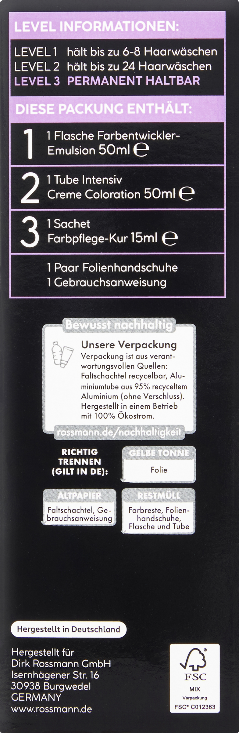 - enthält: 1 Flasche Farbentwickler-Emulsion 50 ml, 1 Tube Intensiv Creme Tönung 25 ml, 1 Sachet Farbpflege-Kur 15 ml, 1 Paar Folienhandschuhe, 1 Gebrauchsanweisung